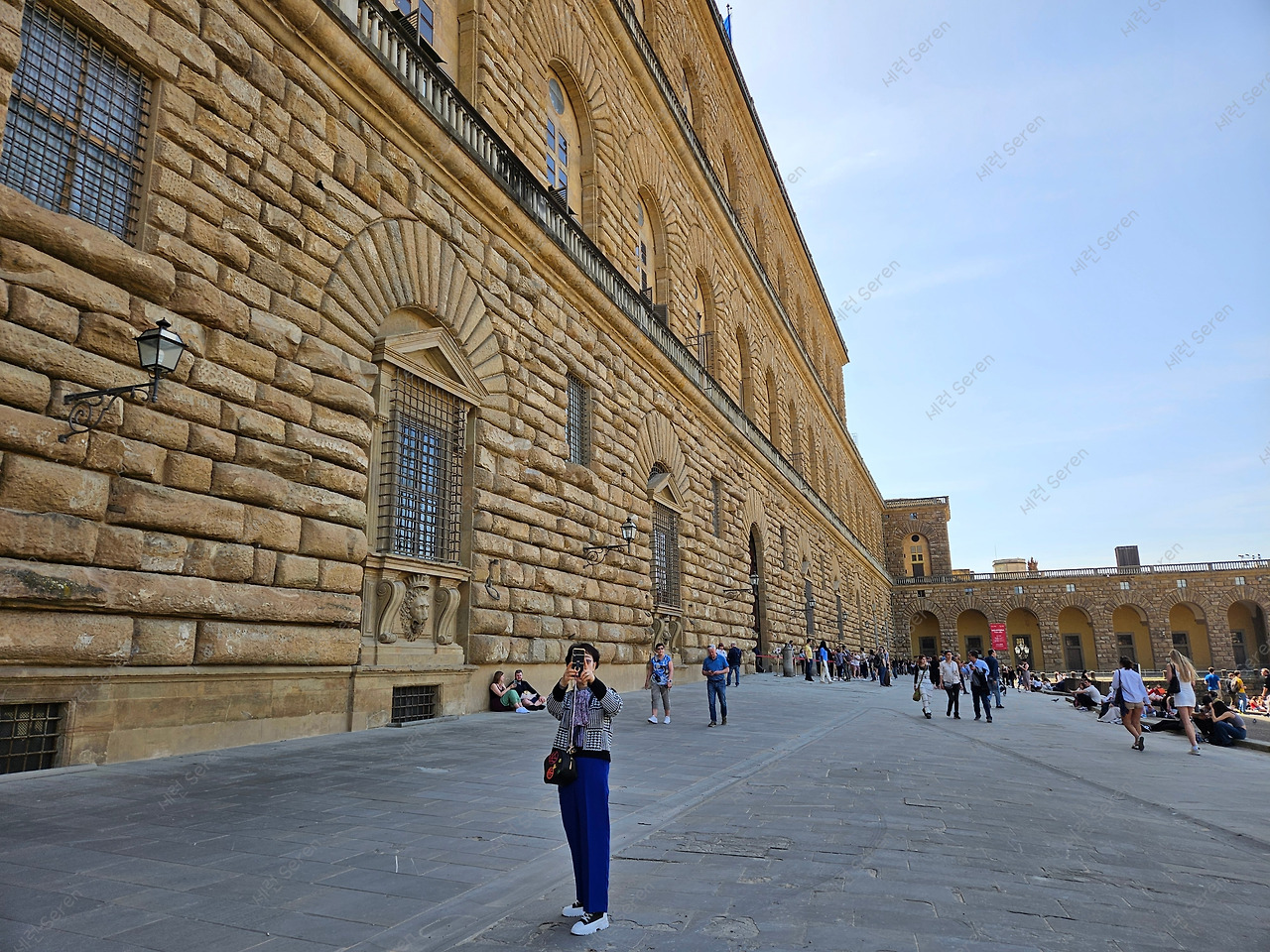 피티 궁전은 1549년 코시모 1세 데 메디치의 부인 에레오노라 디 톨레도가 매입, 이후 메디치 대공가의 공식 거처로 사용된 곳이라고 한다. 특히, 금빛 석조 블록을 그대로 노출시켜 성벽처럼 견고하게 만든 외관을 보니 웅장함과 강인함이 느껴졌다.