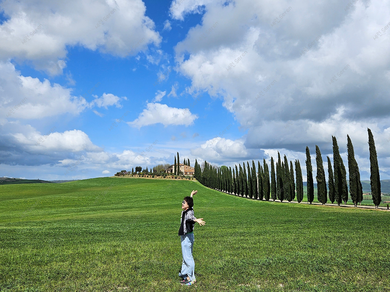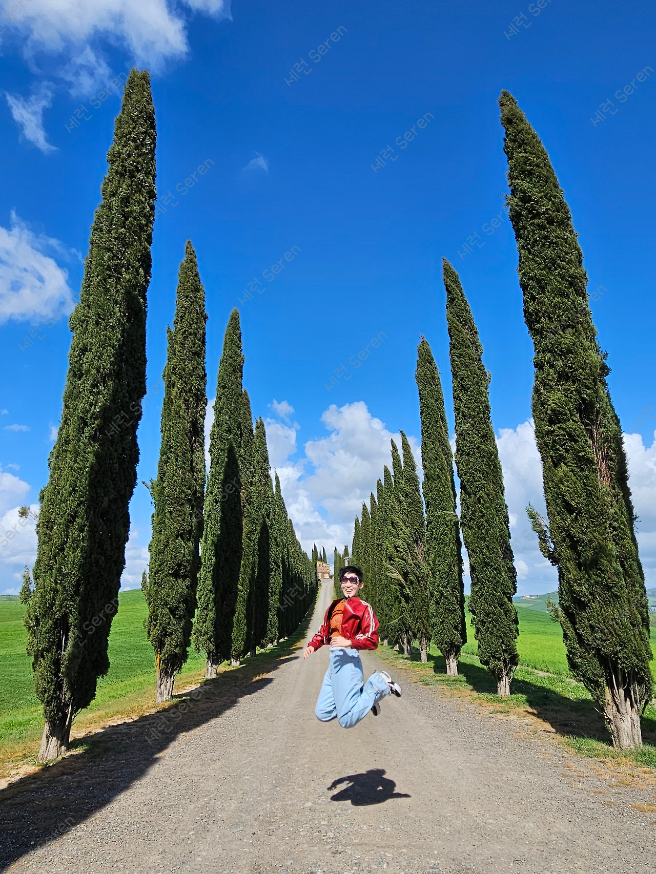 내려서 본 풍경은 푸른 하늘 아래, 초록 잔디와 진녹색 사이프러스가 어우러져 그림 같았다. 바람이 엄청나게 불었지만, 화창한 날씨 덕분에 사진 찍는 내내 엄마와 나는 계속 웃고 있었다. 게다가 가이드님의 주문에 따라 사이프러스와 온갖 포즈로 찍었는데 그중 날아오르는 사진도 건졌다.