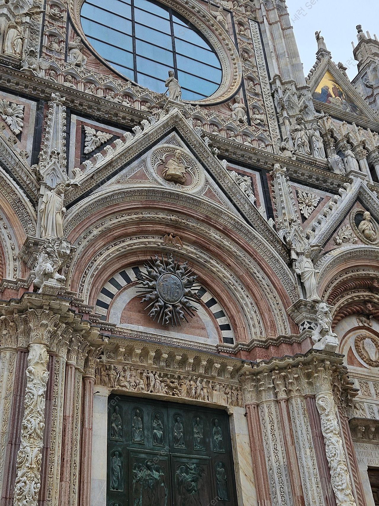 시에나 대성당은 외관이 정말 아름답고 화려하다. 전면에 빠짐없이 조각 장식을 넣고, 다양한 색의 대리석을 퍼즐처럼 끼워 넣었다. 한편, 흰색과 진한 녹색(검정으로 보이는) 대리석을 교차 사용한 것은 시에나의 문장과 관련 있다고 한다. 시에나의 문장은 위쪽은 흰색, 아래쪽은 검은색으로 나뉜 흑백 방패 모양인데, 시에나를 건국한 인물들이 각각 흰말과 검은 말을 타고 왔다는 전설에서 유래했다고 한다.