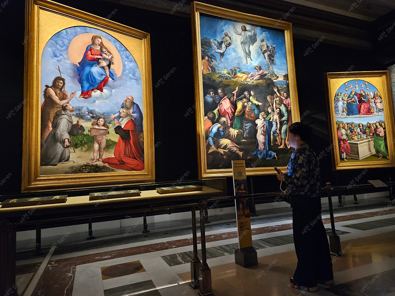 다음으로 작품에만 조명을 비춘 라파엘로(Raphael) 방에 들어갔다. 들어가자마자 보이는 대형화 세 점은 라파엘로가 그린 작품이었다. 성모 마리아가 아기 예수를 안고 하늘 위에 앉아 있는 성모자와 성인들(Madonna with Saints), 라파엘로의 마지막 작품인 그리스도의 변용(The Transfiguration), 성모 마리아가 천상에서 그리스도로부터 왕관을 받는 장면을 묘사한 성모의 대관식(The Coronation of the Virgin)이었다. 이렇게 큰 그림에 다채로운 물감을 쓴 게 놀라웠다.