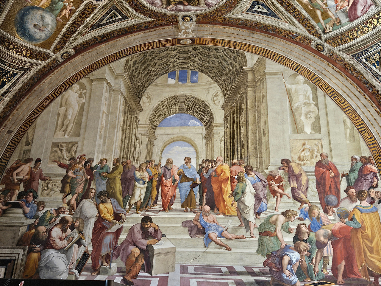 고대 그리스 철학자들이 이상적인 학문과 진리를 논하는 모습을 그린 이 작품에는 50여 명의 철학자·과학자·수학자·예술가가 그려져 있다고 한다. 대표적으로 하늘을 가리켜 이상 세계를 강조하는 플라톤과 손바닥을 아래로 내려 현실세계를 강조하는 아리스토텔레스가 중앙에 그려져 있다. 한편, 오른쪽 가장자리에 검은 모자를 쓰고 관객을 쳐다보는 인물은 라파엘로 본인이라고 한다.