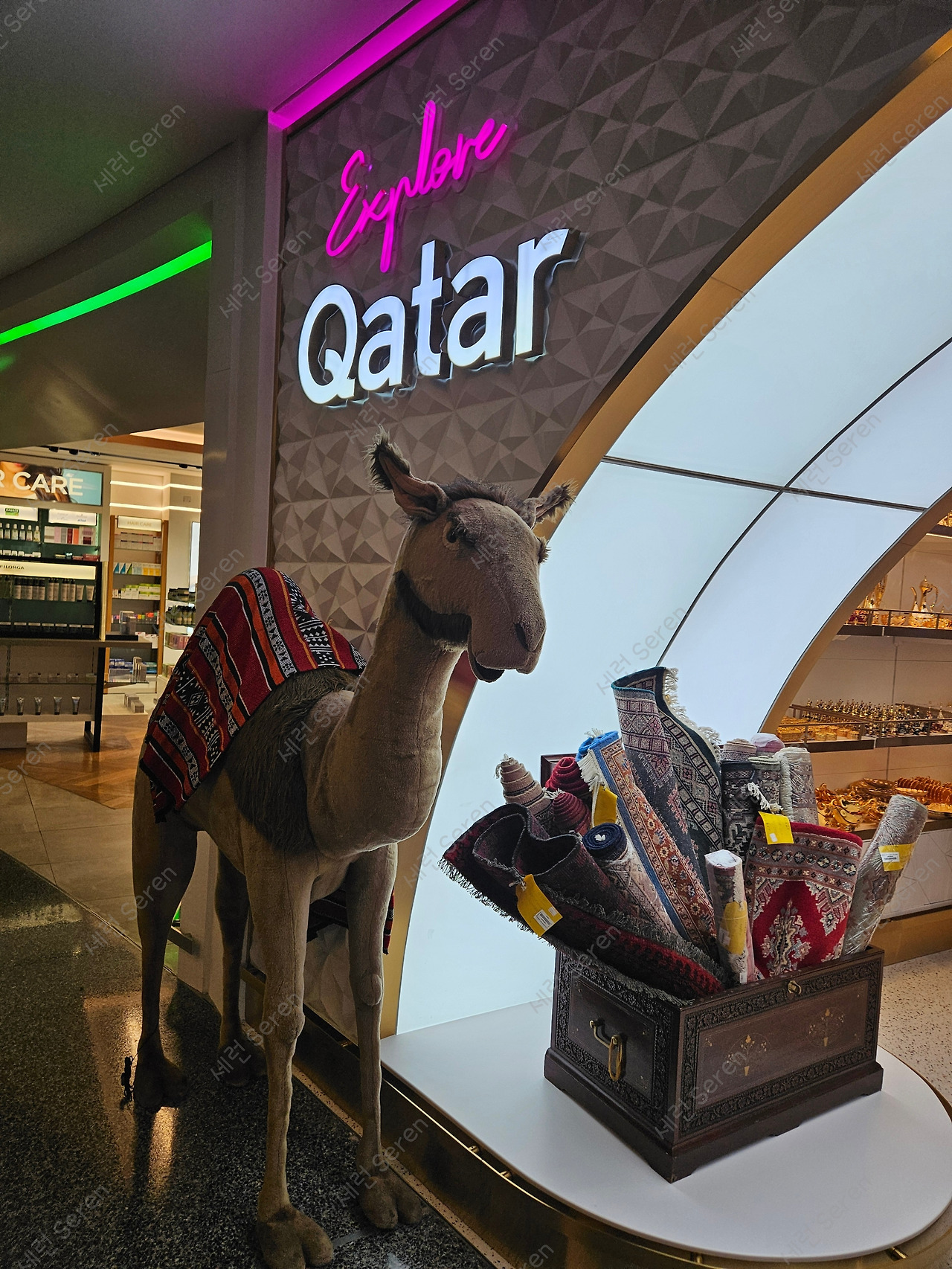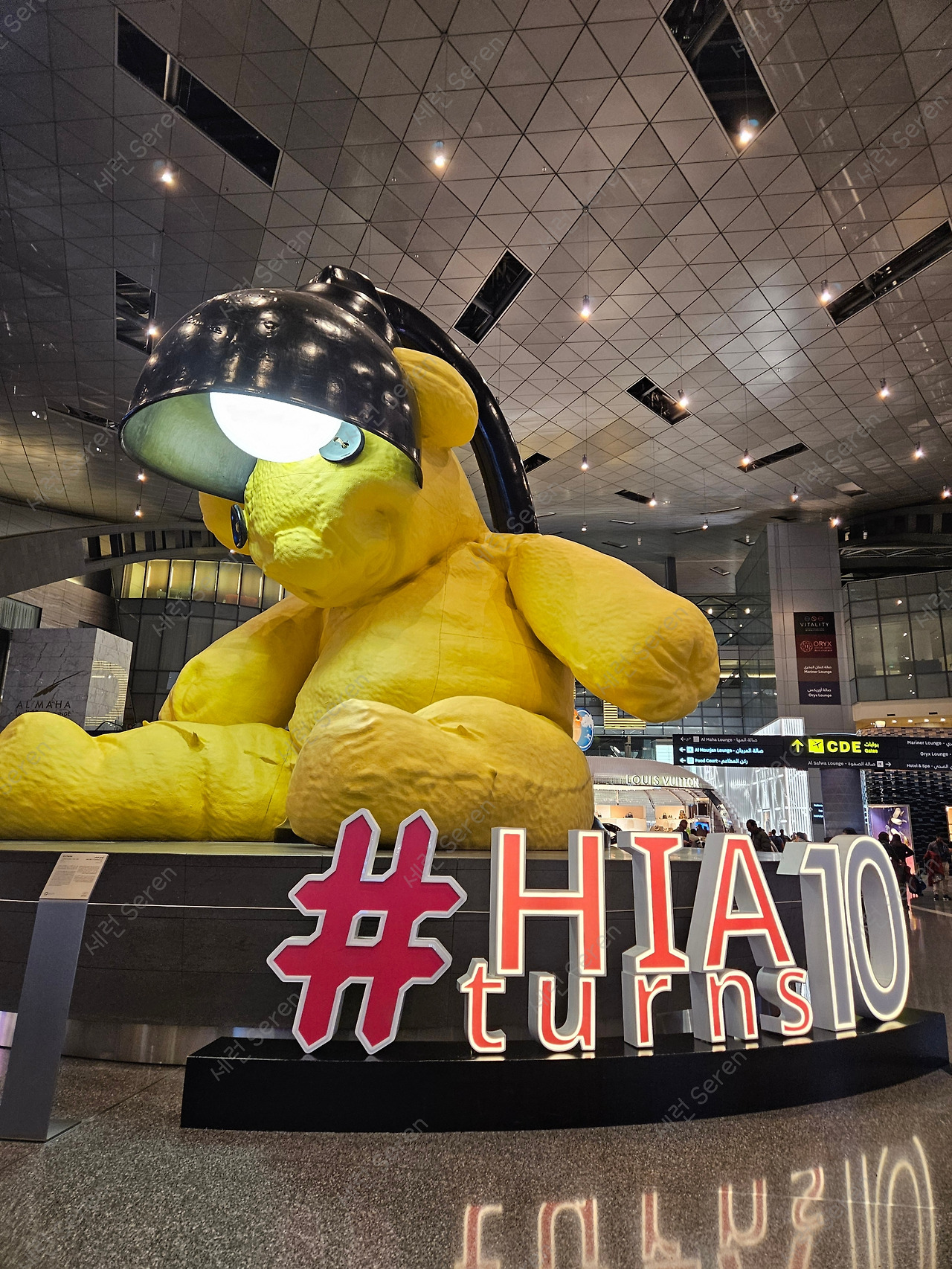 10시간 반 정도 밤 비행기를 타고 카타르 도하 하마드 공항에 도착했다. 엄청 큰 노란 테디베어, '램프 베어(Lamp Bear)' 앞에서 많은 사람들이 인증 사진을 찍고 있었다. 중동 국가 카타르 답게 낙타 인형도 전시되어 있었다. 덕분에 잠시 카타르를 여행하는 기분을 즐겼다.