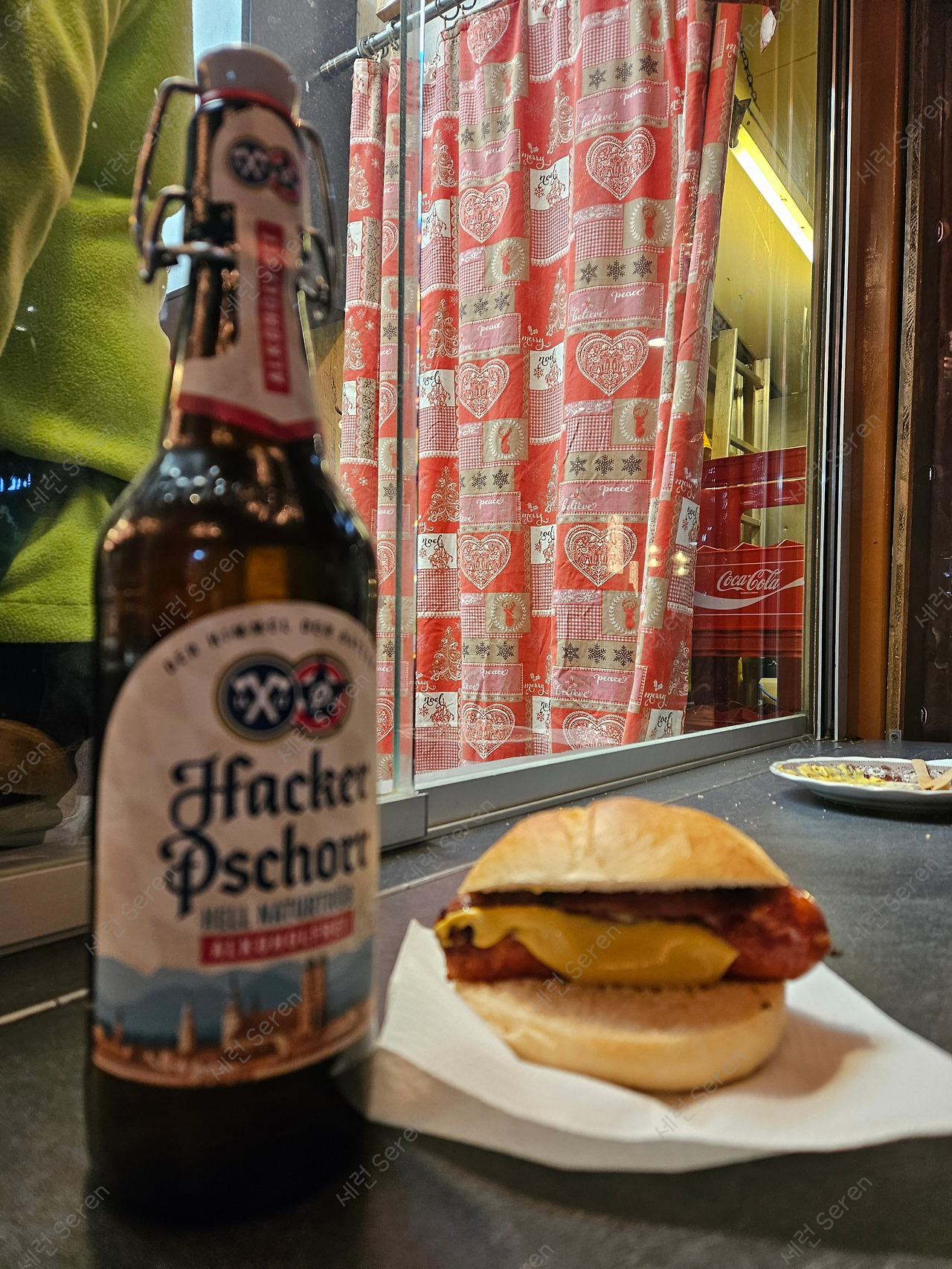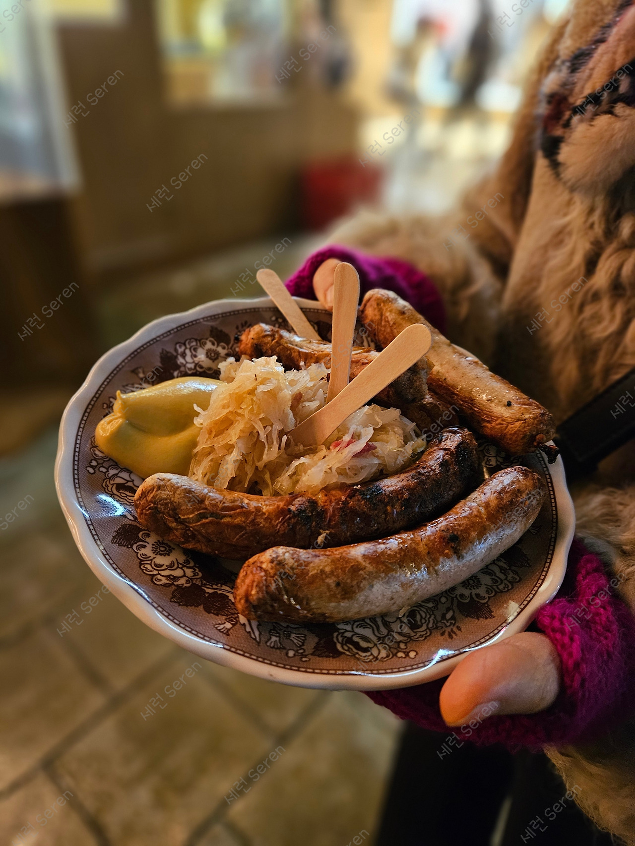 한편, 사람이 너무 많아 이산가족되기 쉬운 신시청사 앞을 벗어나 조용한 골목으로 들어갔다. 직접 소시지를 구어내고, 나름 손님들이 많은 부스 하나를 찾았다. 소시지를 빵에 끼운 음식인 브랏부어스트(Bratwurst)와 양배추로 만든 독일식 김치 같은 자우어크라우트(Sauerkraut)를 곁들인 소시지와 맥주를 주문했다. (접시와 맥주병은 반납하면 보증금을 돌려준다.)
