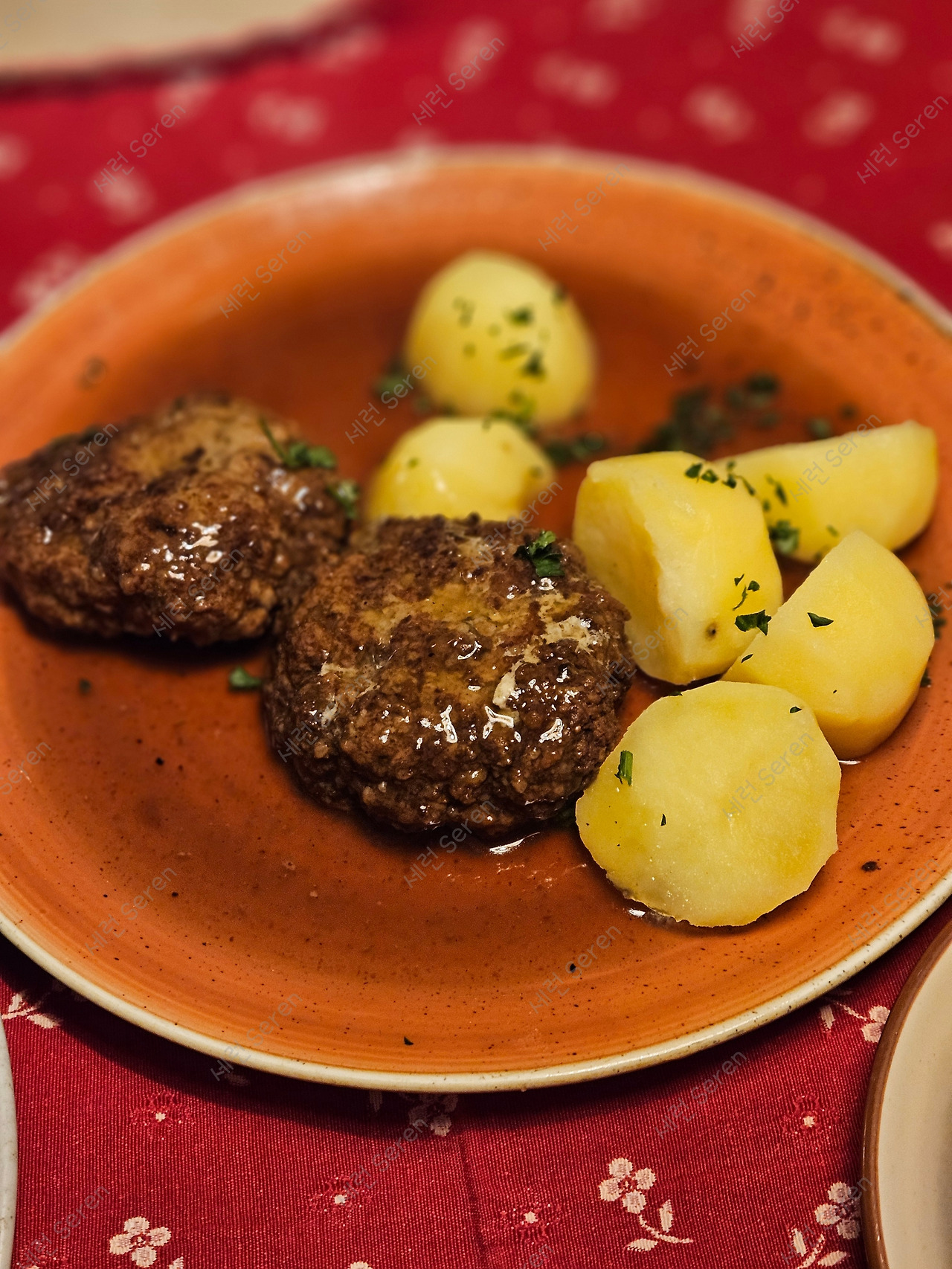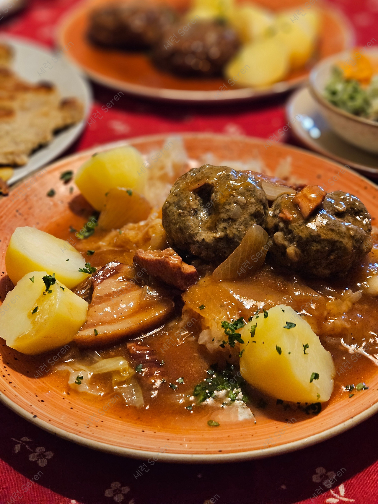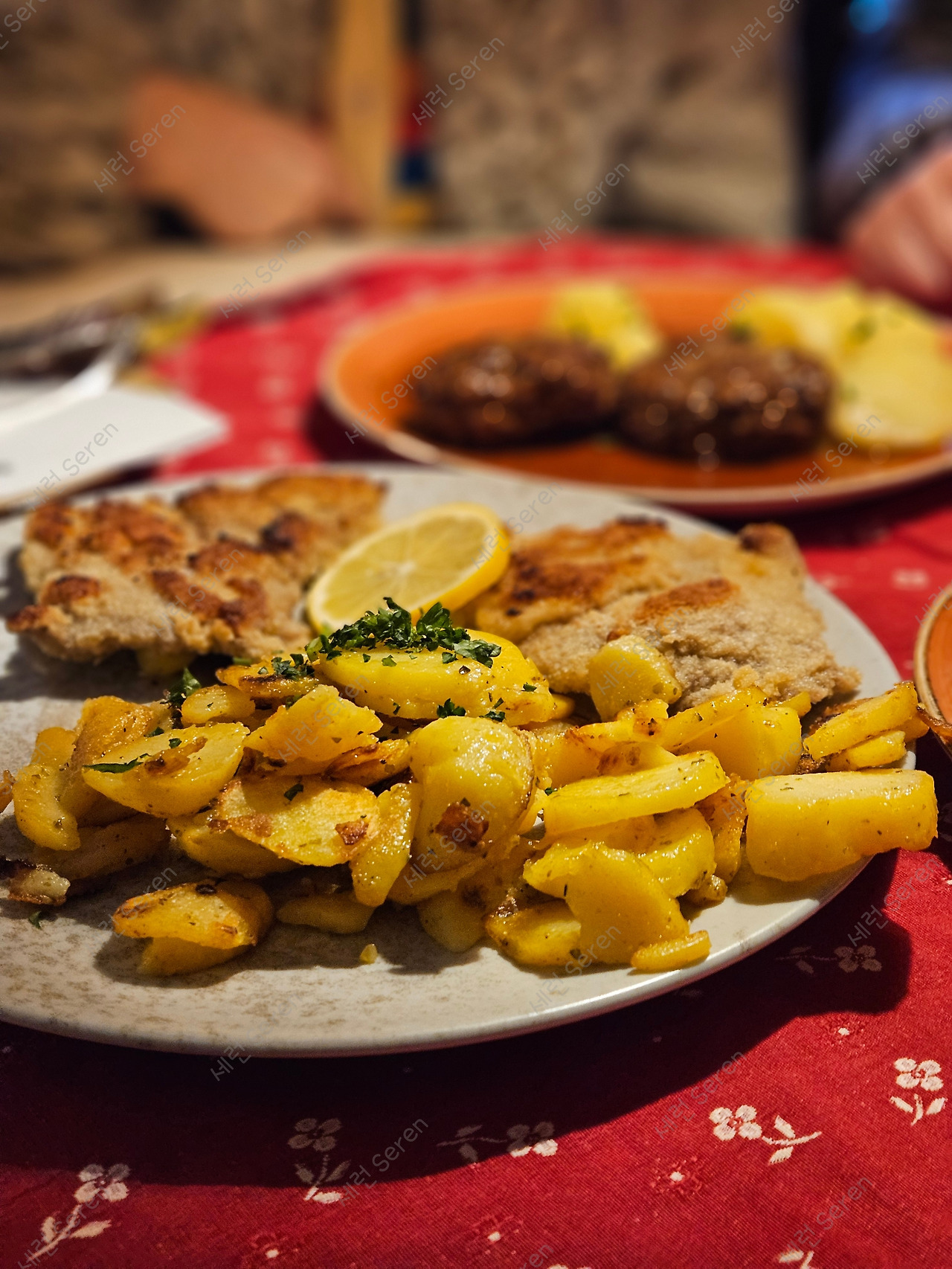 가족끼리, 특히 성인 남자 둘과 오니 여러 메뉴를 시켜 먹어볼 수 있는 게 좋았다. 엄마랑 둘이 다닐 때는 메뉴 하나도 벅찬데, 아빠와 남동생이랑 가면 음식 부족한 걸 걱정해야 한다. 슈니첼, 함박스테이크, 미트볼 등 고기 요리를 종류별로 주문했다. 감자는 어느 메뉴에나 빠지지 않고 나온다.