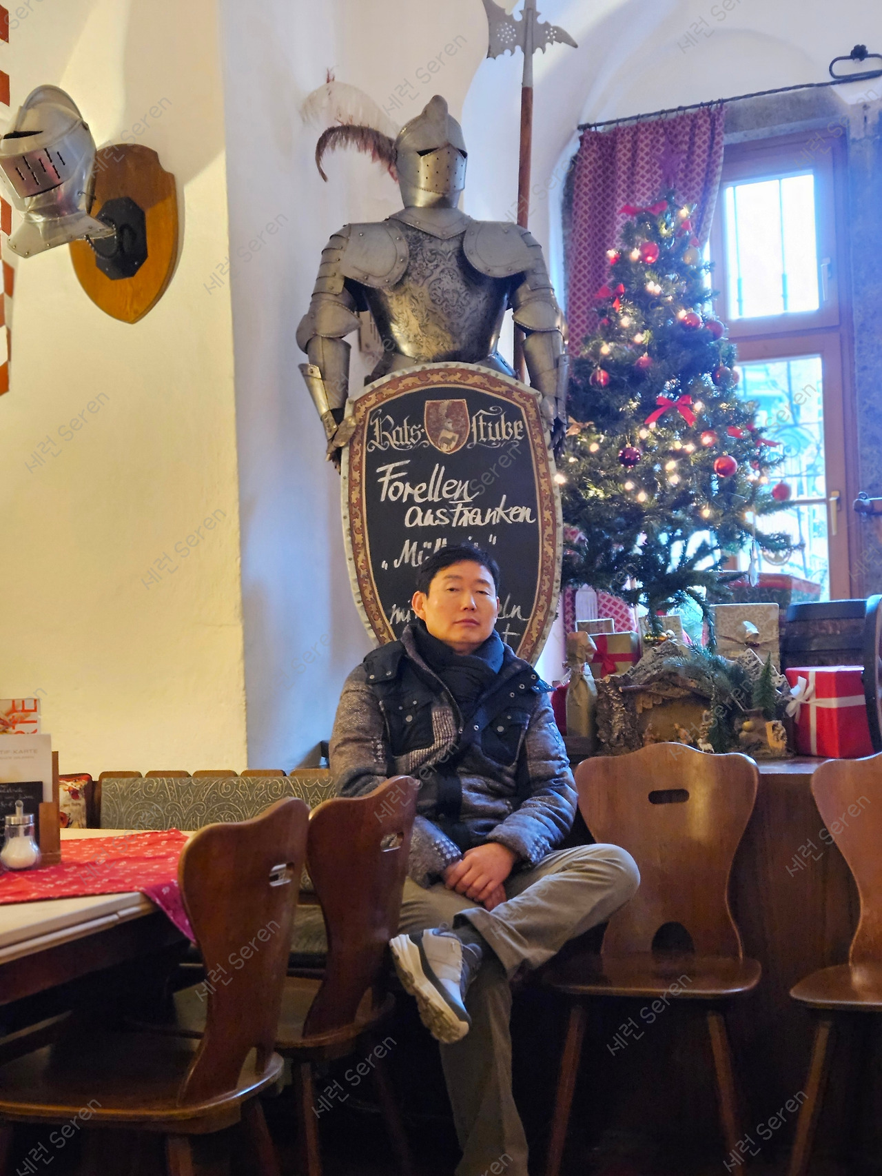 주문을 마치고 우리가 앉은 곳 가까이에 있던 중세 기사 갑옷 앞에서 아빠 독사진을 찍었다. (아빠는 사진을 찍어주겠다 하면 빼는 법이 없다!)
