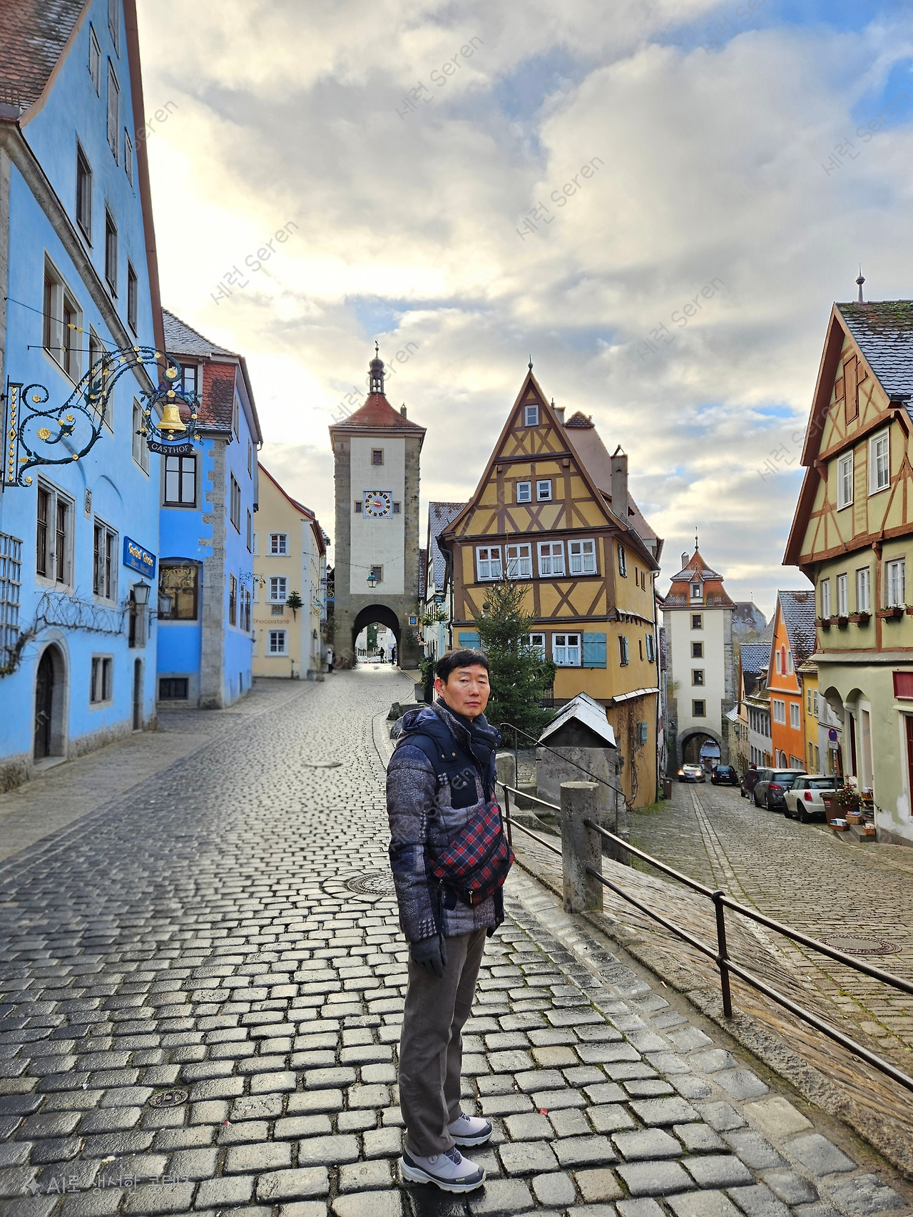 플뢴라인(Plönlein)은 작은 평원이라는 뜻이다. 이곳은 Y자 형태로 길이 갈라지면서, 목조 주택을 사이로 성문탑인 지버스 탑(Siebersturm)과 코볼첼 탑(Kobolzeller Turm)이 보이는 곳이다. 거의 5년 전에 왔을 때와 똑같아서 반가웠다. 사람 없을 때를 노려 우리는 돌아가며 사진을 찍었다.