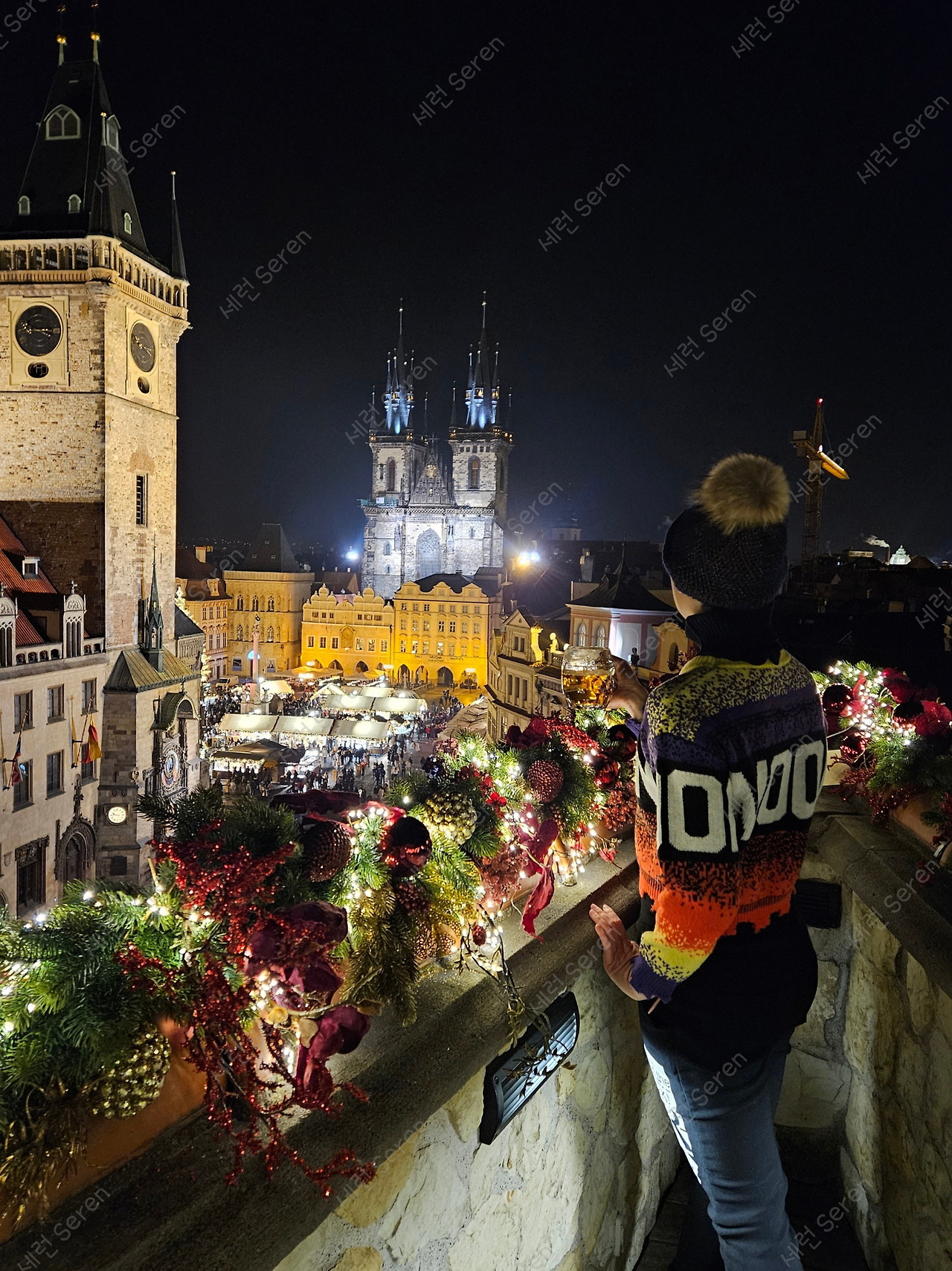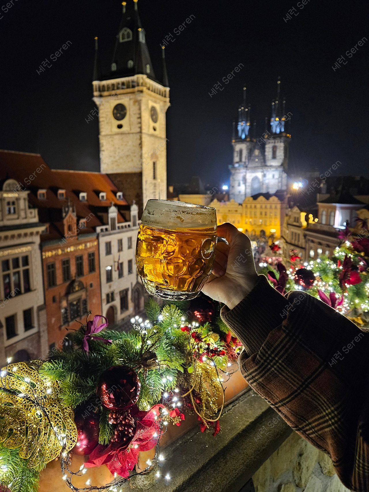 올드타운 광장 중심에 위치한 Hotel U Prince의 루프탑 바에 왔다. 야외에 스탠딩 원형 테이블이 놓여 있었는데 운 좋게 전경이 보이는 쪽의 테이블을 잡을 수 있었다. 맥주 세 잔과 내 몫의 따뜻한 티를 한 잔 시켰다. 맥주가 나온 뒤 광장을 가까이에서 내려다볼 수 있는 테라스로 갔다. 크리스마스 분위기로 테라스도 솔잎, 솔방울, 오너먼트로 꾸며져 있었다. 엄마 맥주를 내 거처럼 들고 분위기를 잡아 보았다. (천문시계와 틴 성당, 그 앞의 크리스마스 마켓을 보며 설정샷 찍기 성공!)