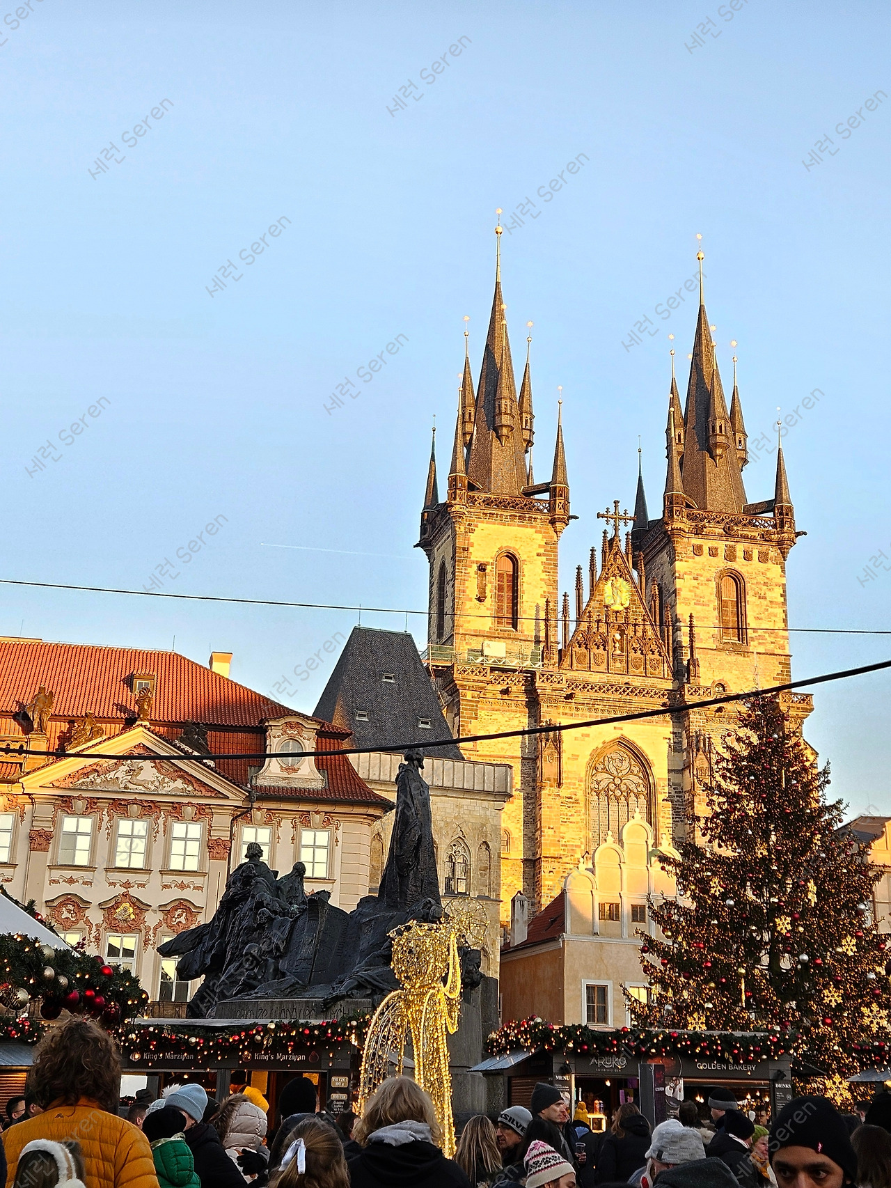 우리는 프라하의 구시가 광장에서 열리는 메인 크리스마스 마켓으로 갔다. 뉘른베르크 못지않게 엄청난 부스와 인파로 북적북적했다. 틴 성모 마리아 교회 앞의 크리스마스트리는 엄청 컸다.