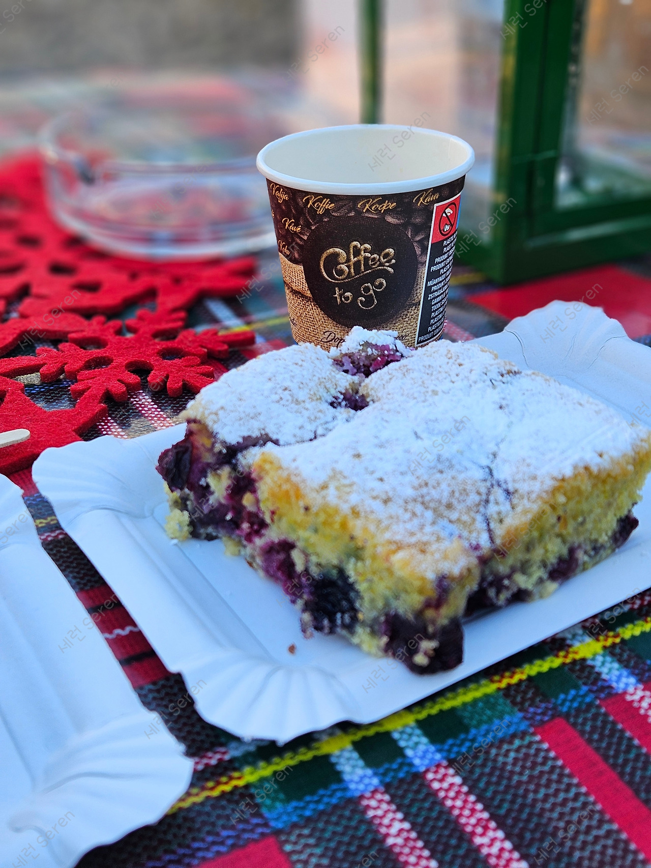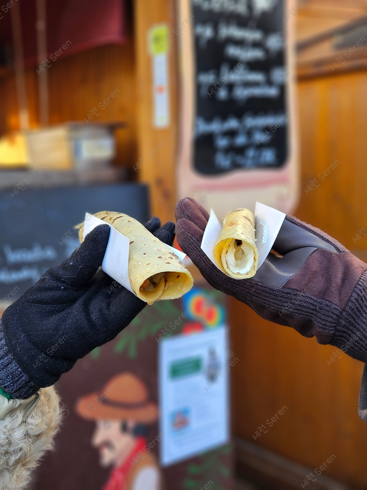 우선 스보르노스티 광장(Náměstí Svornosti)으로 갔다. 10시가 좀 넘은 시간이었는데 크리스마스 마켓 상점들이 장사를 시작했다. 따뜻한 라테와 블루베리 케이크, 얇은 밀가루 반죽에 샤워크림과 속재료를 넣어주는 체코식 크레페 Palačinky를 먹었다.