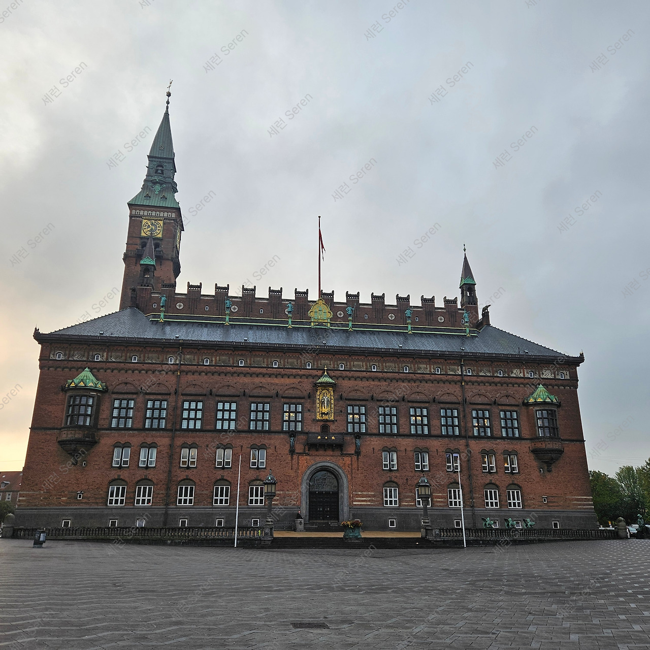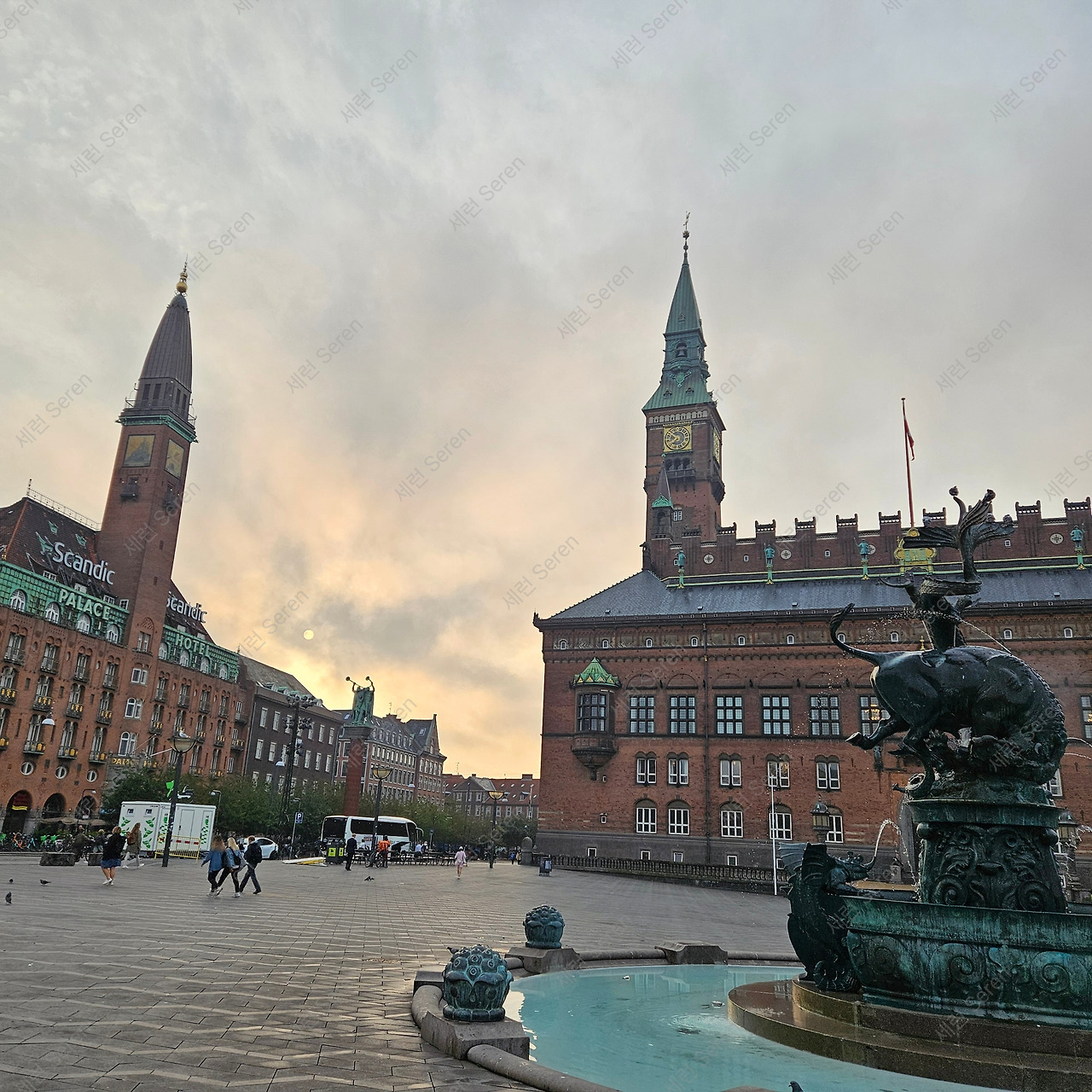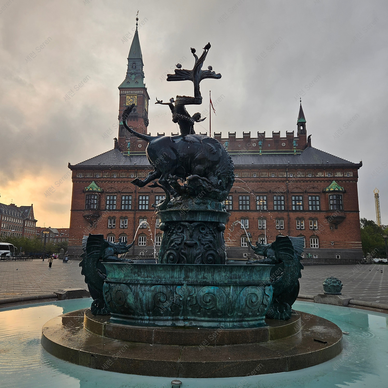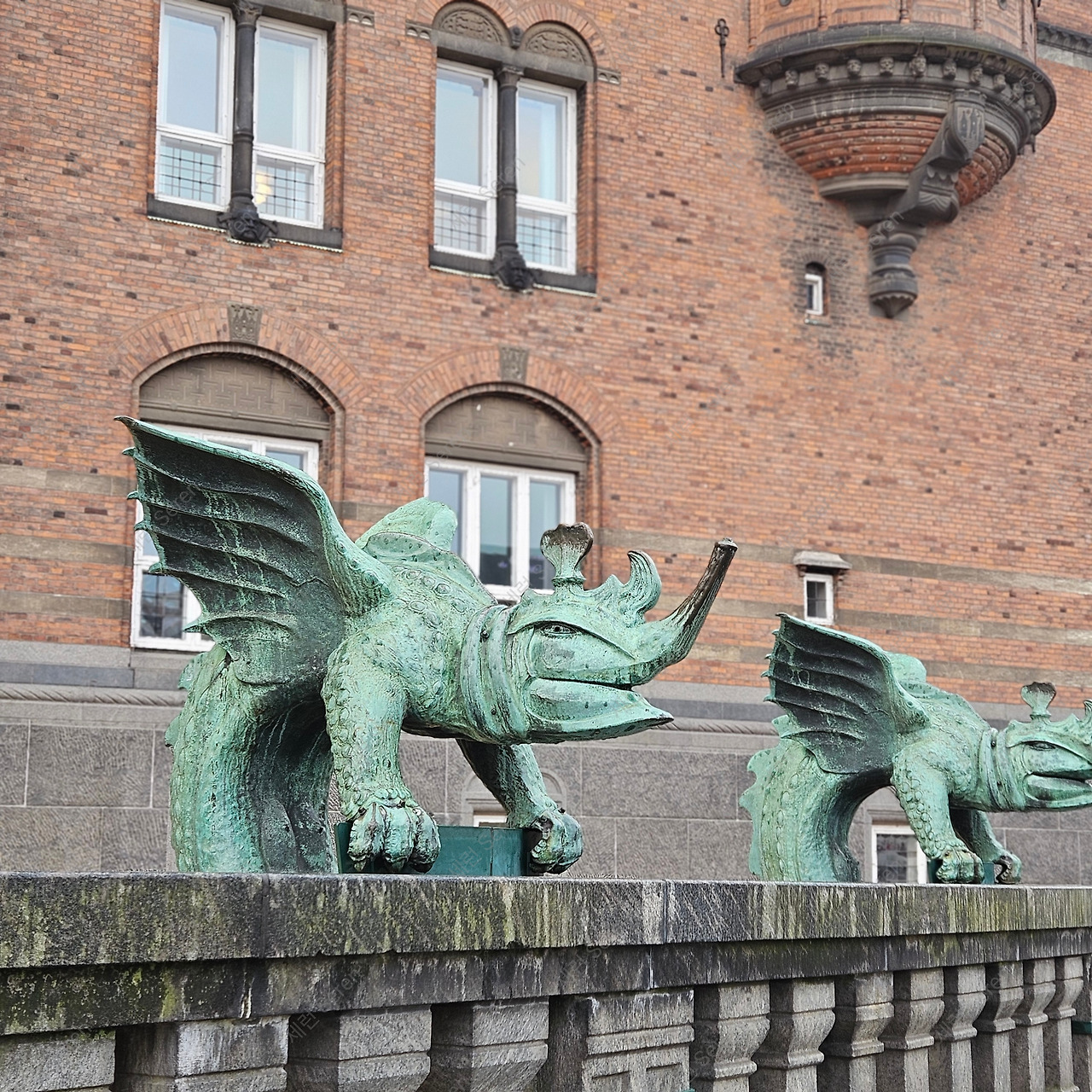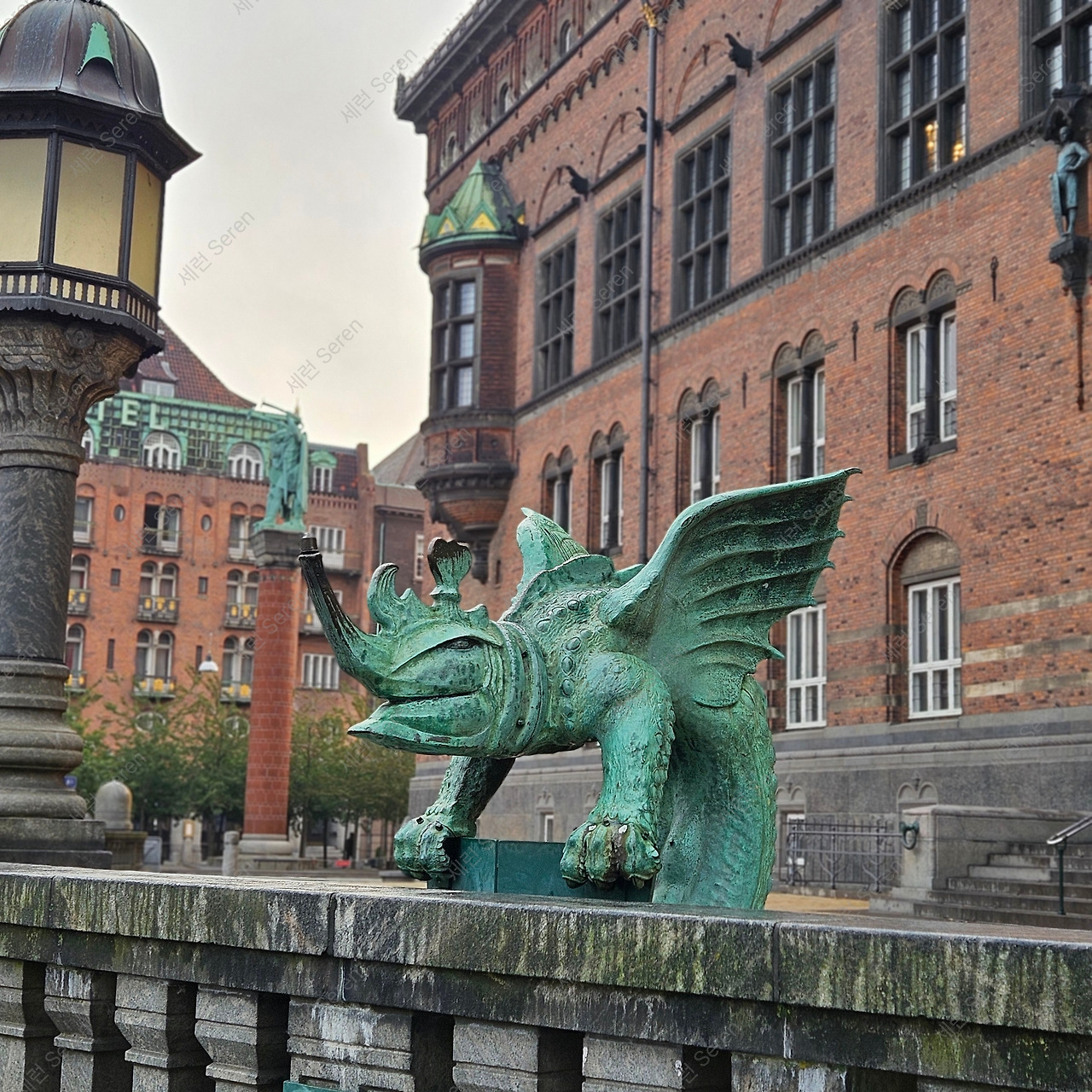 산책의 목적지인 시청사 건물에 도착했다. 엄청 넓은 광장 앞에 펼쳐진 붉은 벽돌의 시청 건물이 웅장했다. 거기에 청동이 포인트가 되어 단조롭지 않게 만들었다. 시청을 지키는 듯한 특이한 동물상이 눈길을 끌었다. 광장 중앙에 설치된 용의 분수 일부라고 한다.