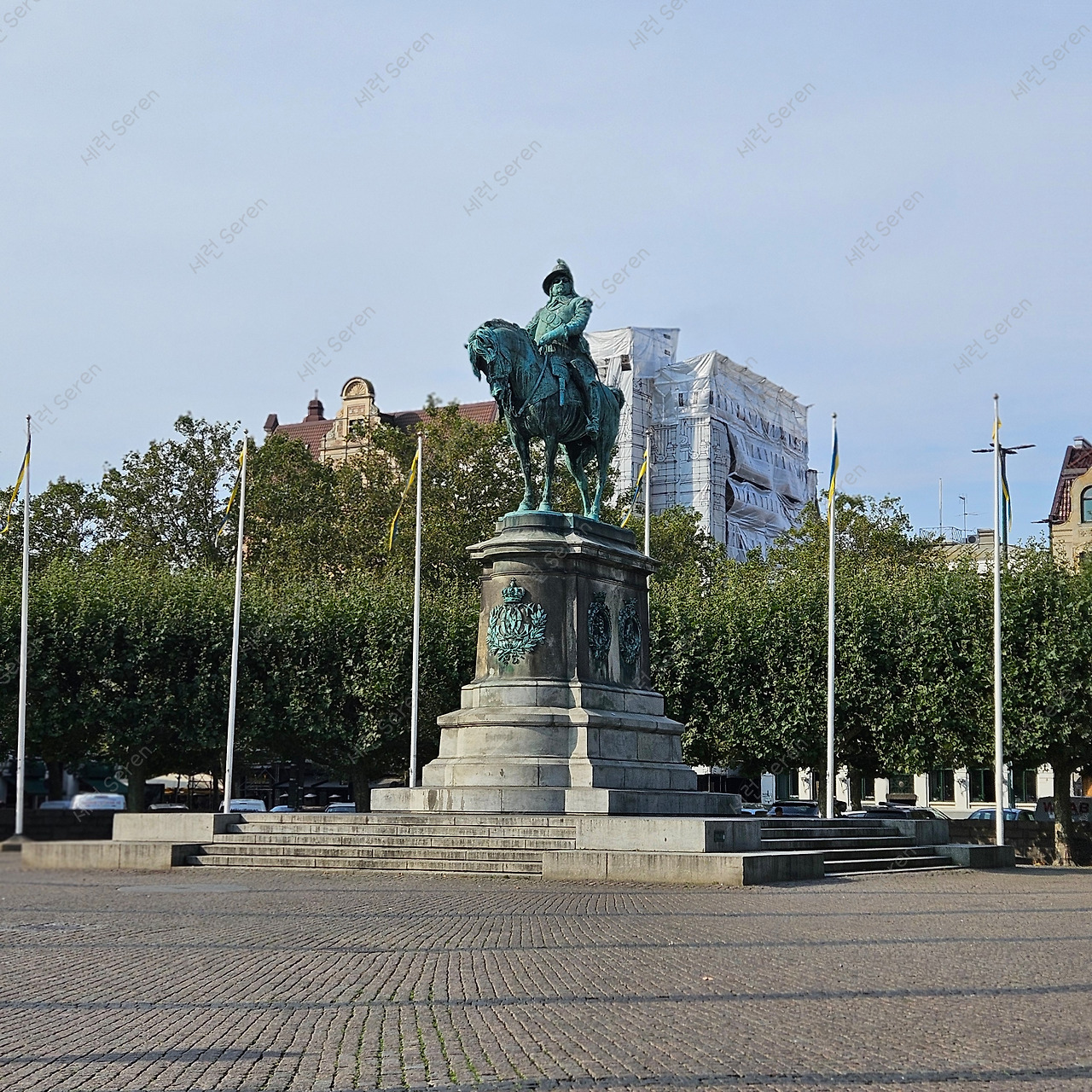 약국 옆에 위치한 시청사 뒤로 Stortorget (스투르토리옛), 이름 그대로 '큰 광장'이 시원하게 펼쳐져 있다. 이곳에 자리한 동상의 주인공은 구스타프 2세 아돌프(Gustav II Adolf)인데 스웨덴을 유럽 강국으로 끌어올린 국왕이고, ‘북방의 사자(Lion of the North)’라 불렸다고 한다. 이 국왕이 등지고 있는 곳, 다시 말해 말 엉덩이 쪽은 덴마크 방향이라고 한다. (두 나라는 기네스에 오를 정도로 서로 전쟁한 나라라고 한다!)