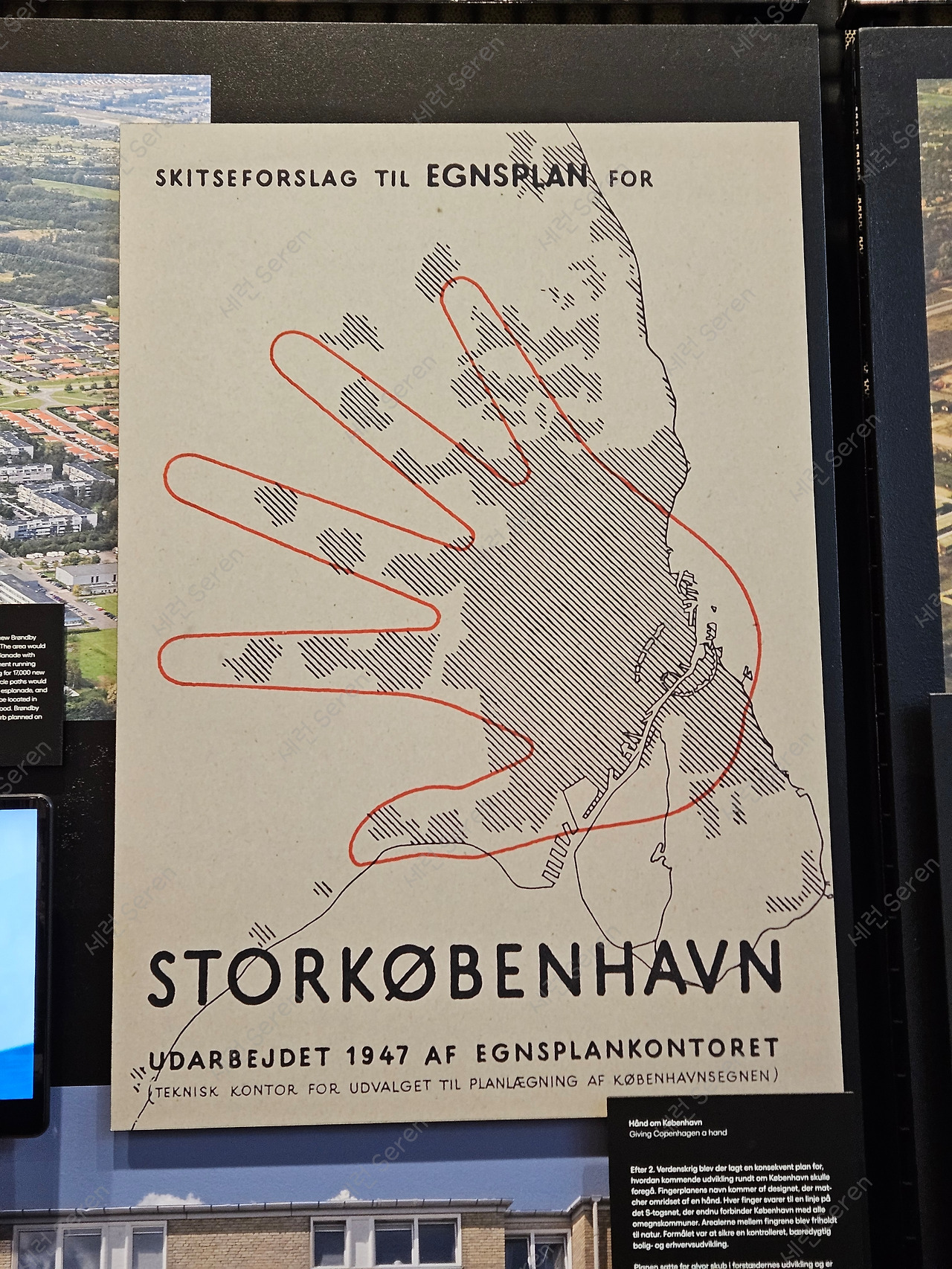 전시는 상설 전시와 특별 전시 하나씩이었다. 특별 전시는 뉴욕의 거리를 찍은 건데 크게 볼 게 없었다. 상설 전시에서 코펜하겐 건축물들의 역사를 볼 수 있어 좋았다. 한편, 코펜하겐에 집중된 인구를 분산하고 균형 발전을 위해 1970년대에 만든 "Fingerplanen (다섯 손가락 계획)"이 인상적이었다. 코펜하겐 중심부는 ‘손바닥(palm)’이고, 그 중심에서 뻗어나가는 다섯 개 교통축을 ‘손가락(fingers)’으로 비유한 계획이었다. 손가락에 주거·상업·산업 지역을 만들고 그 사이에는 녹지(Green wedges)를 두는 것인데 현실적인 도시계획이라는 생각이 들었다.