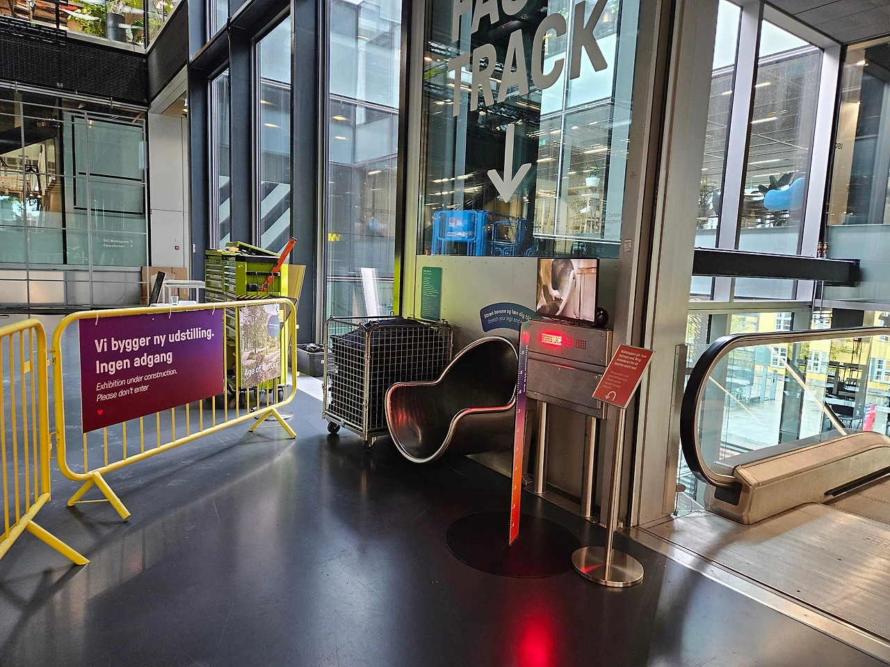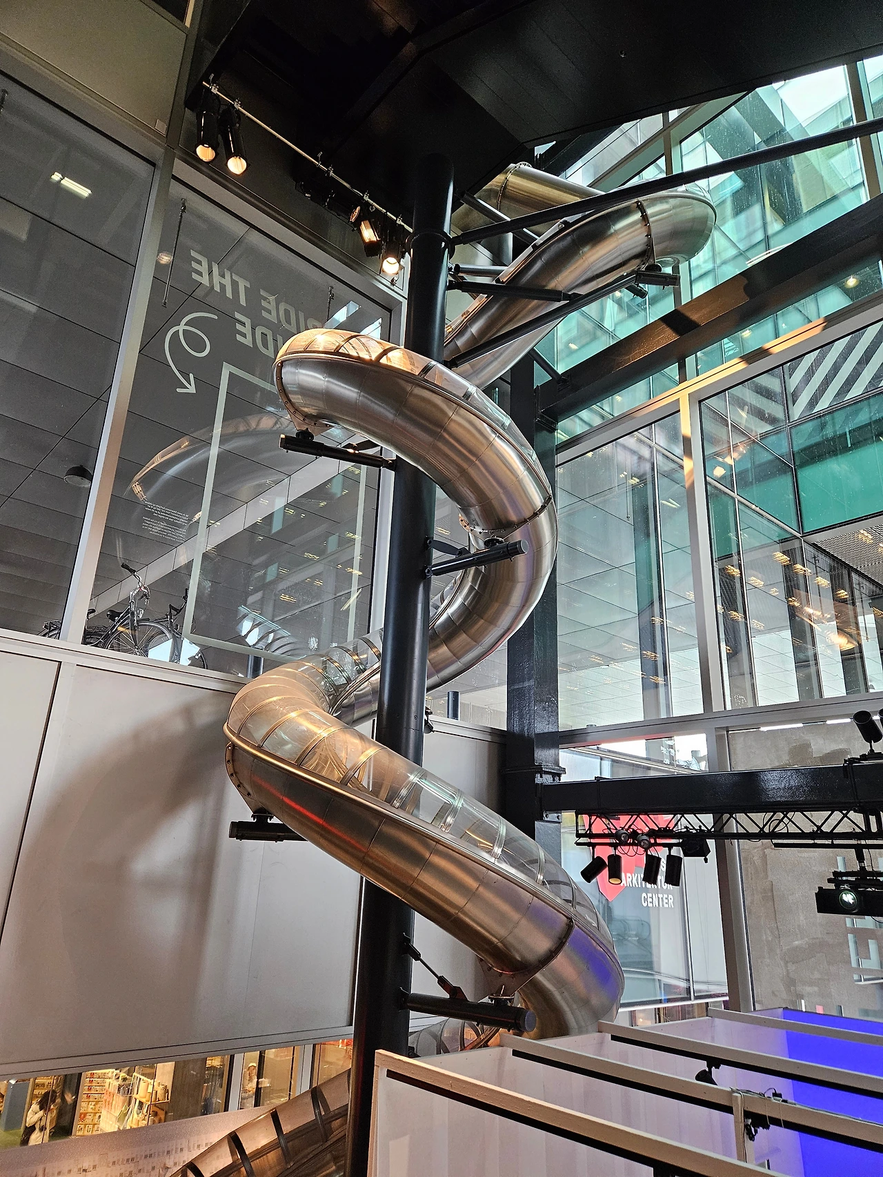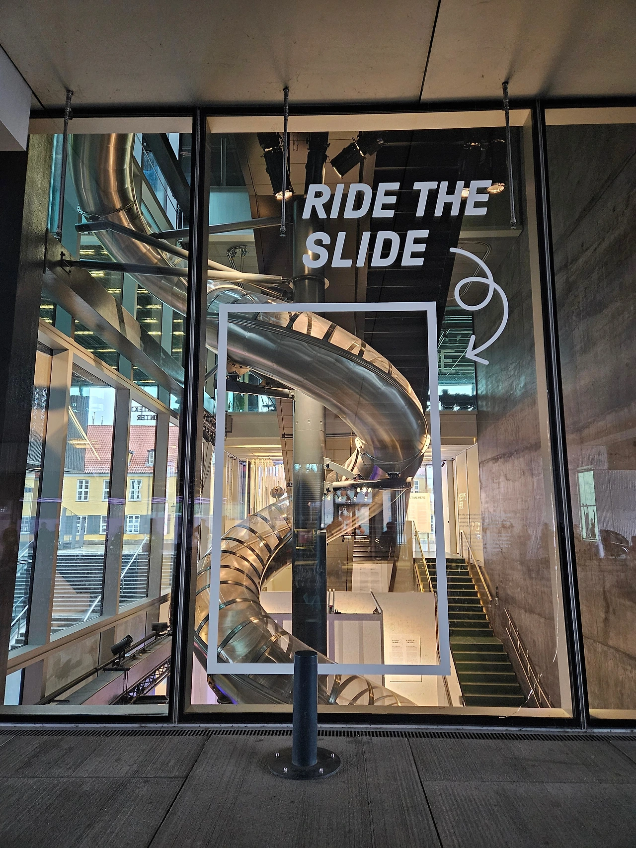 DAC에는 전시물보다 유명해 보이는 실내 미끄럼틀이 있다. 건물 높이 만한 이 미끄럼틀 옆에 썰매 역할을 하는 천이 있다. 타기 전에 이 천을 발에 끼우고 초록불이 뜨면 출발하면 된다. 초반에 가속도가 확 붙어서 살짝 스릴 있었다. 처음에 한 번 타보고 감을 잡은 뒤, 두 번째 탈 때는 동영상 촬영을 하는 여유를 부렸다.