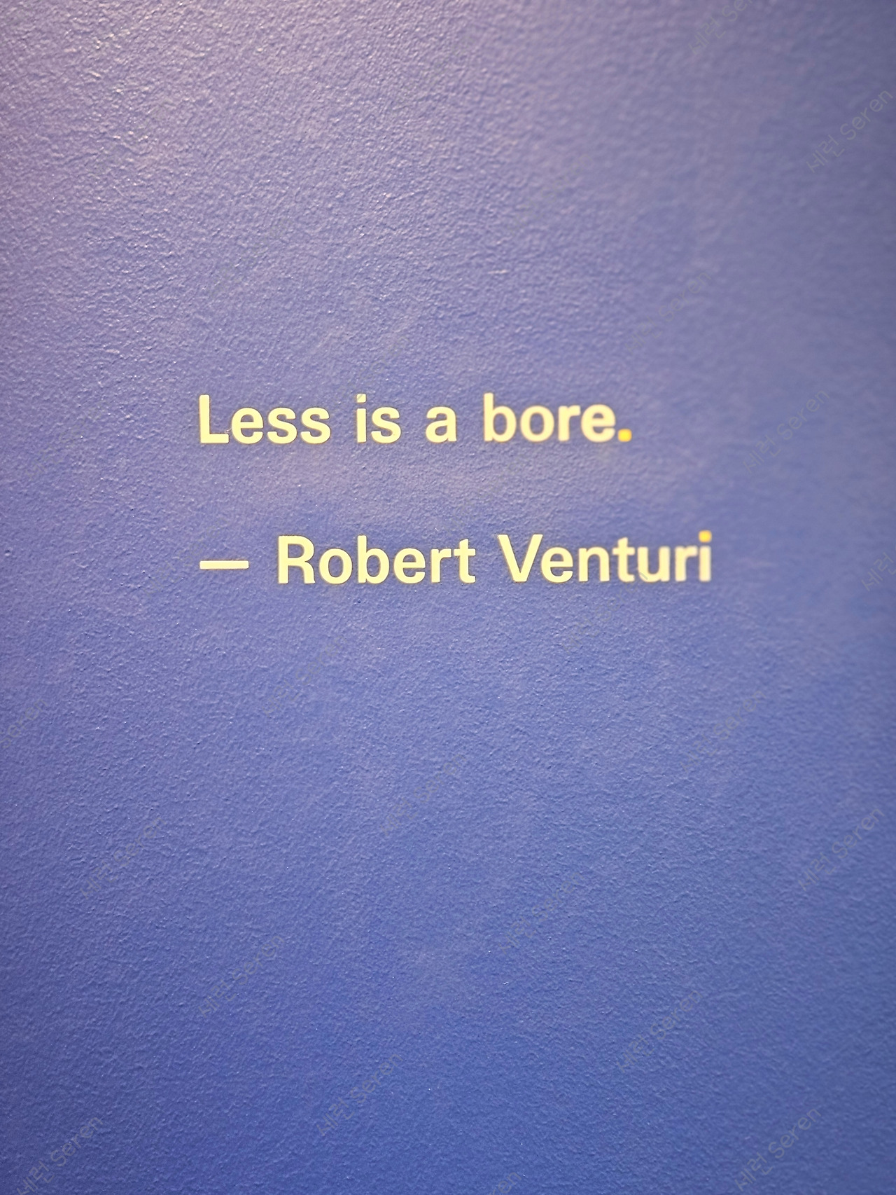 마지막은 로버트 벤투리(Robert Venturi)의 어록으로 시작한다. "Less is a bore"은 직역하면 “덜 한 것은 지루하다.”는 뜻으로, “Less is more(적을수록 더 많다)”라는 단순하고 절제된 미니멀리즘 디자인을 비꼬아 말한 거라고 한다. 로버트 벤투리는 복잡함, 장식, 다양성이 오히려 흥미롭고 풍부한 디자인을 만든다고 주장했다고 한다. 그래서 이 방의 전시물들은 다양한 원색으로 개성을 확실하게 드러내고, 각각의 완성품 내에서도 평범하지 않은 포인트들이 있는 게 특징이다.