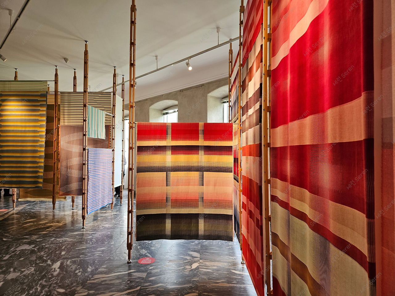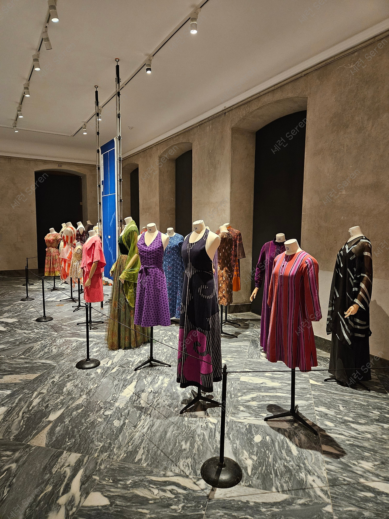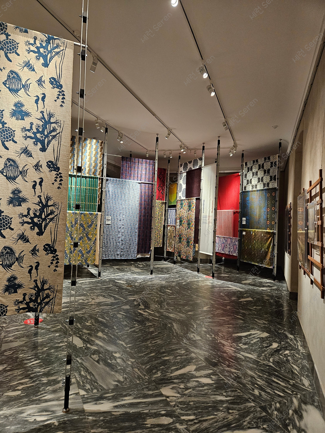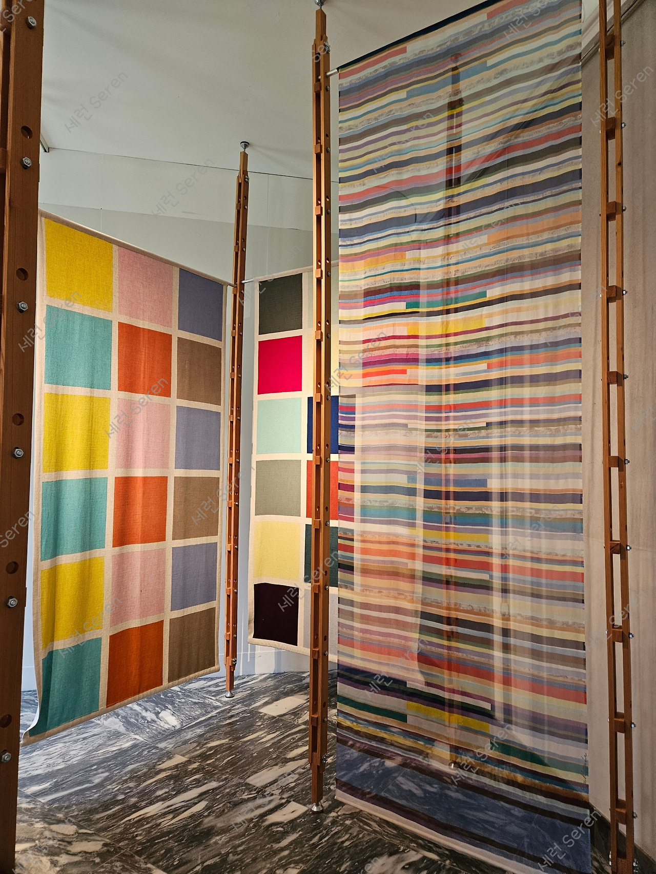 다음은 다양한 색과 문양으로 뽑아낸 원단이 전시된 공간이었다. 원단을 활용한 소품도 구경할 수 있다. 여태 완제품만 보다가 그 바탕이 되는 원단 디자인에 대해 의식하는 계기가 되었다. 저마다 어떤 색과 문양으로 배열할지에 대해 디자이너의 깊은 생각이 담겨있겠다는 생각이 들었다.