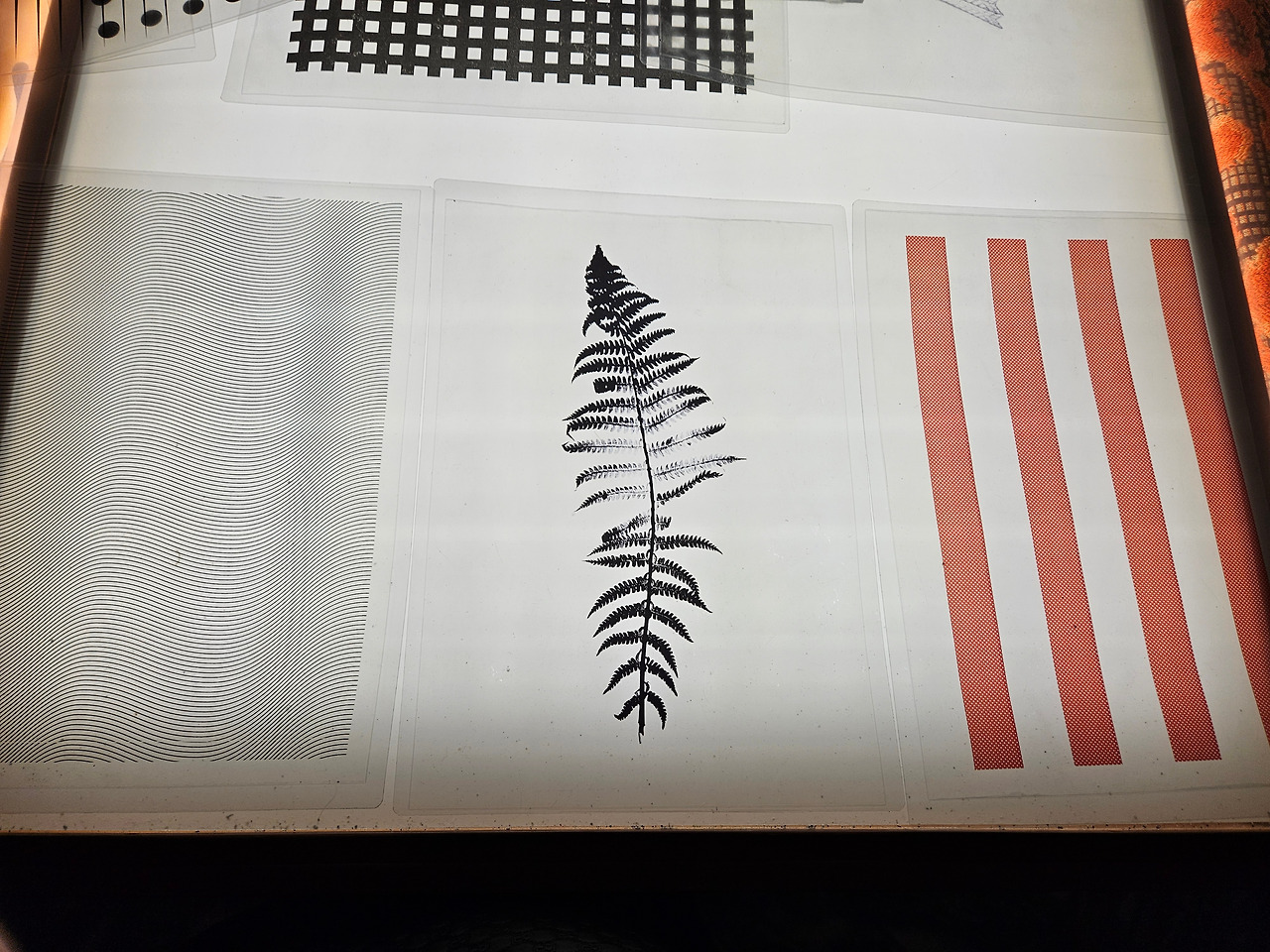 이어진 공간에서는 다양한 이미지와 패턴이 그려진 투명 필름을 겹쳐 나만의 디자인을 만들어 볼 수 있었다. 잔 물결, 빨간 줄무니, 잎사귀 필름 순으로 겹쳐 보았다. 순서에 따라 약간씩 느낌이 달라지는 것도 볼 수 있어 신기했다.