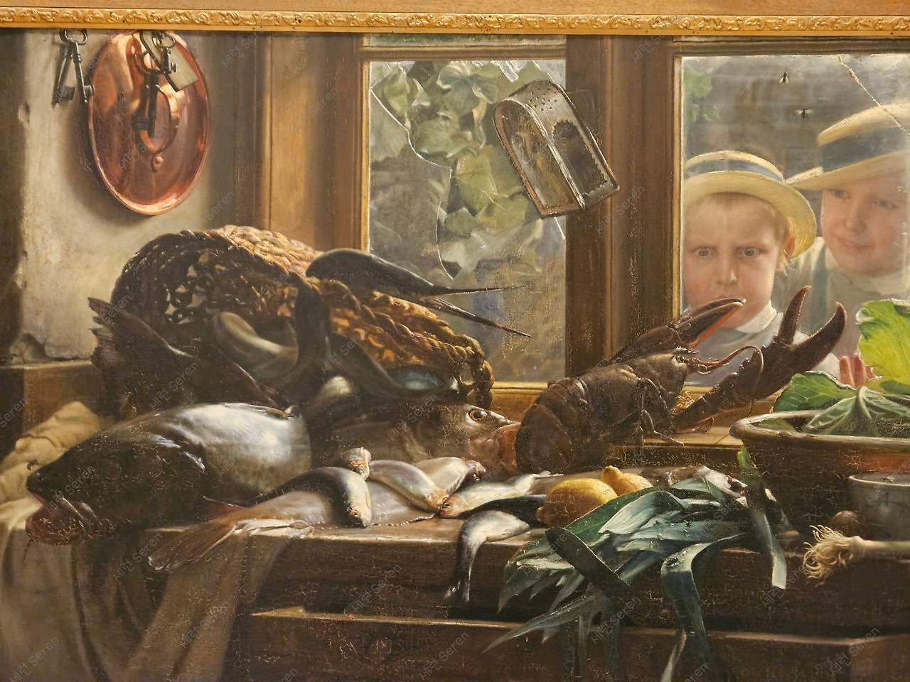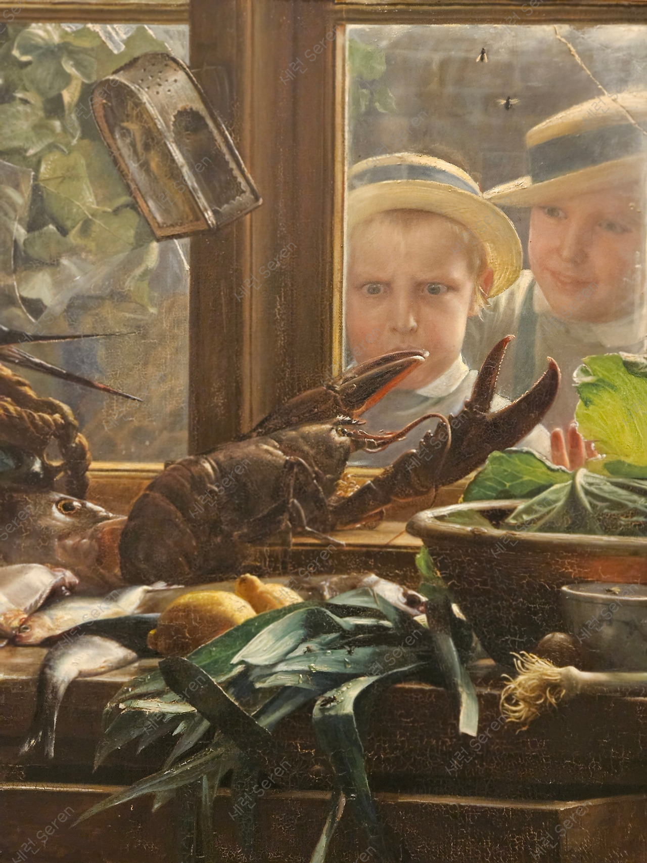 또 다른 그림은 창문을 통해 주방을 들여다보던 아이가 아직 싱싱하게 살아있는 랍스터를 보고 놀란 표정을 잘 잡아냈다. 곧 있으면 조리될 랍스터는 창문 밖으로 달아나고 싶어 보인다.