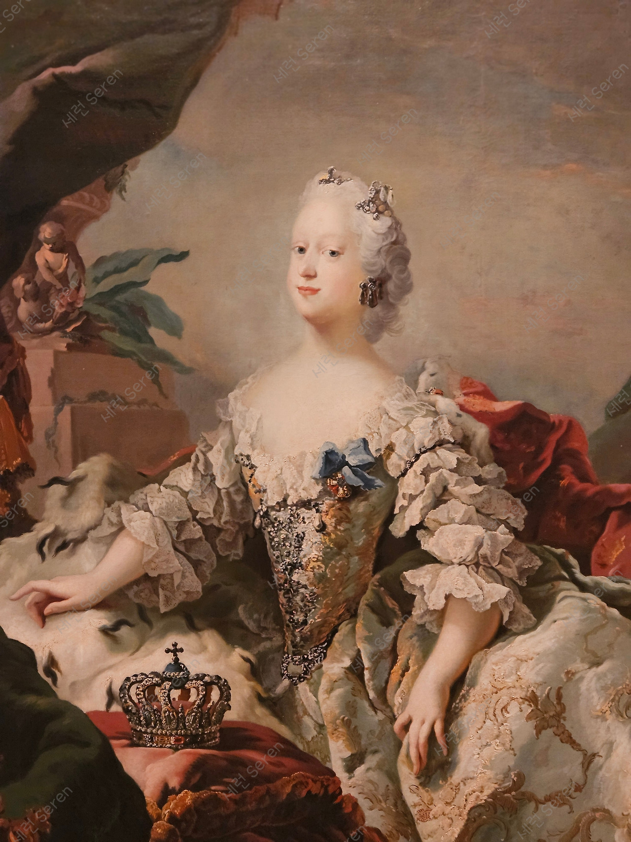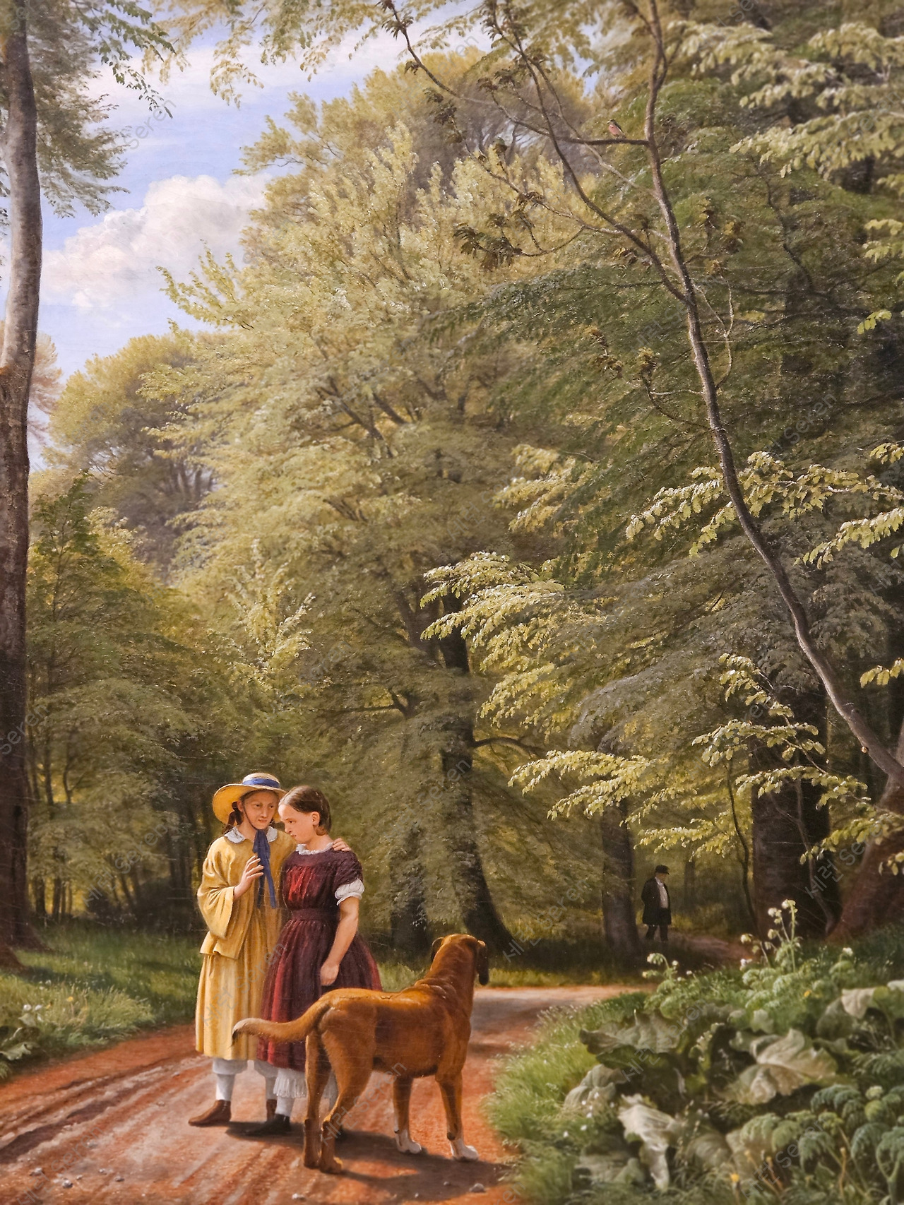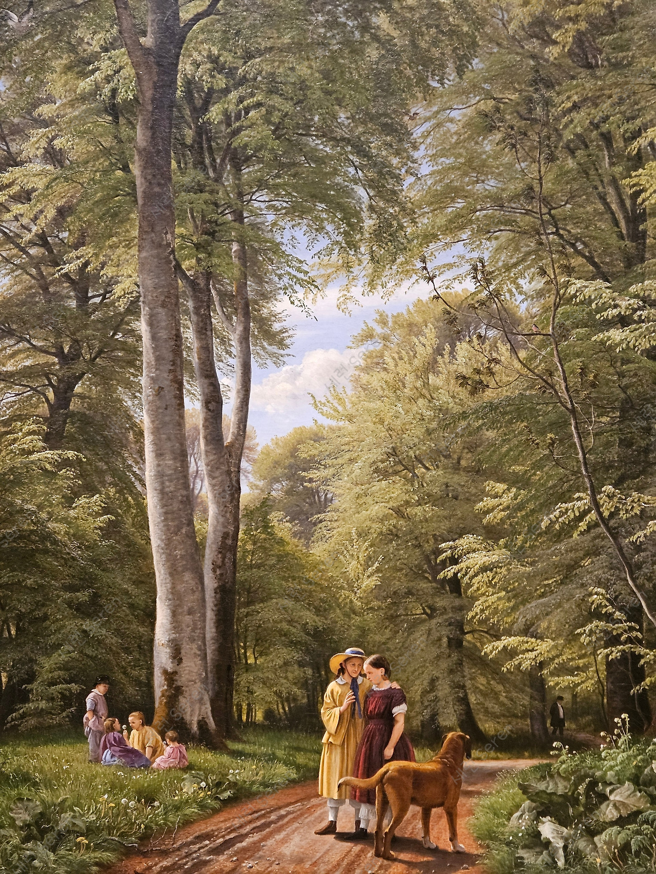 울창한 숲 길의 좌측은 잔디밭에 앉아 담소 나누는 아이들이 있고, 우측에는 남자가 바닥을 쳐다보고 있다. 아이만 한 큰 개가 이 남자를 주시하고 있다. 노란 옷을 입은 사람이 엄마 같은데 빨란 드레스의 아이에게 뭔가를 말하고 있다. 내 생각에는 빨간 옷을 입을 아이가 맏이이고, 엄마가 숲 속의 남자를 경계하고 동생들을 잘 돌보라고 얘기하는 그림 같았다.