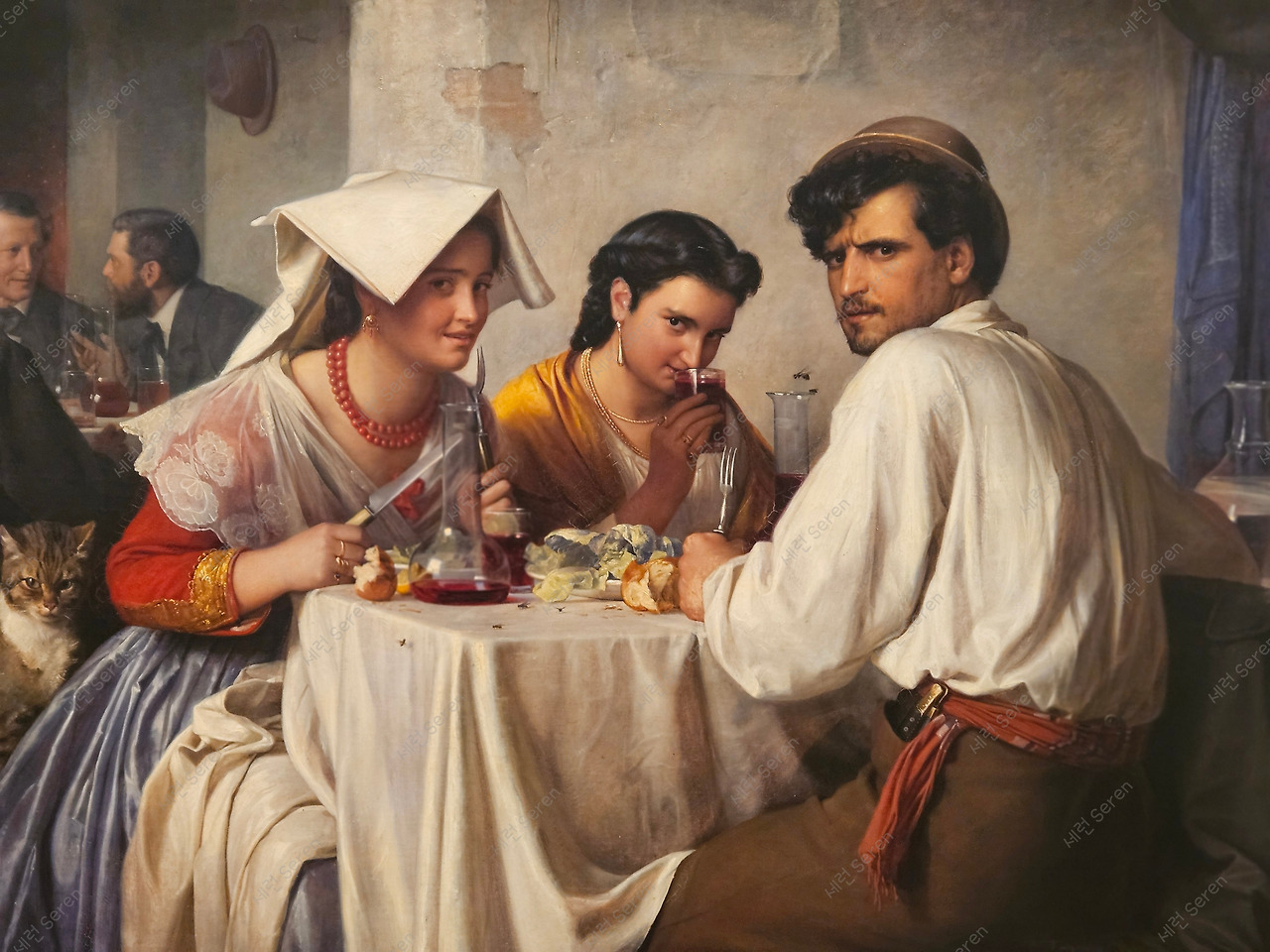 식사 중인 세 사람을 비롯해 고양이까지 정면을 응시하며 관객과 눈을 마주치는 듯한 그림이 보였다. 어쩌면 당시에 화가가 세 사람에게 양해를 구하지 않고 주인공으로 그리고 있었고, 이들이 의심하는 순간을 포착해 낸 거 같았다. (오늘로 치면 '불법 카메라' 같은 건가!)