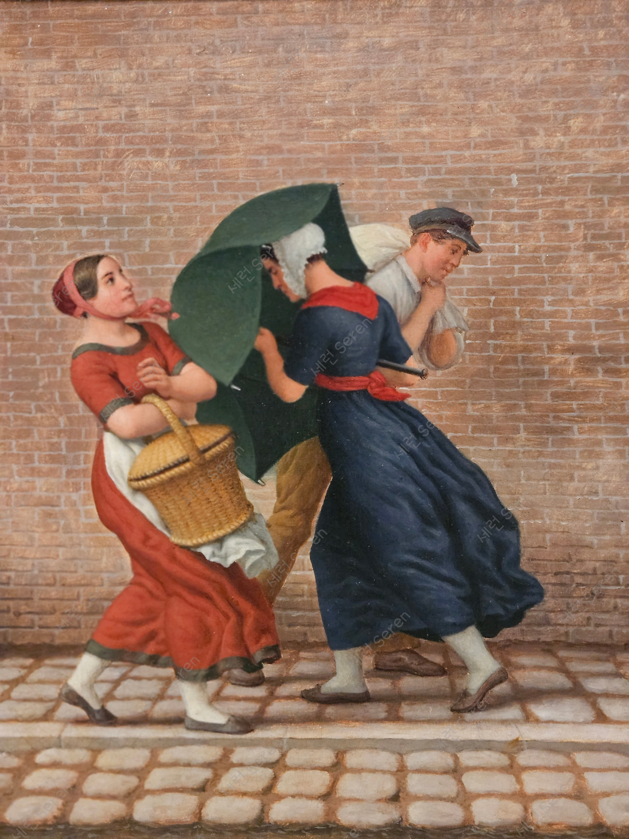덴마크인들은 비 오는 날 우산을 쓰기보다 우비를 입는다고 한다. 바람이 엄청나게 불어 우산이 뒤집힐 정도기 때문이다. 그래서 '비바람 부는 날씨의 거리 풍경(Street scene in windy and rainy weather)'이란 제목의 그림에도 우산이 안 뒤집히게 비바람을 뚫고 가는 사람이 그려진 거 같다. (하지만 우산에 치이는 주변 사람들은 짜증 날 듯하다!)