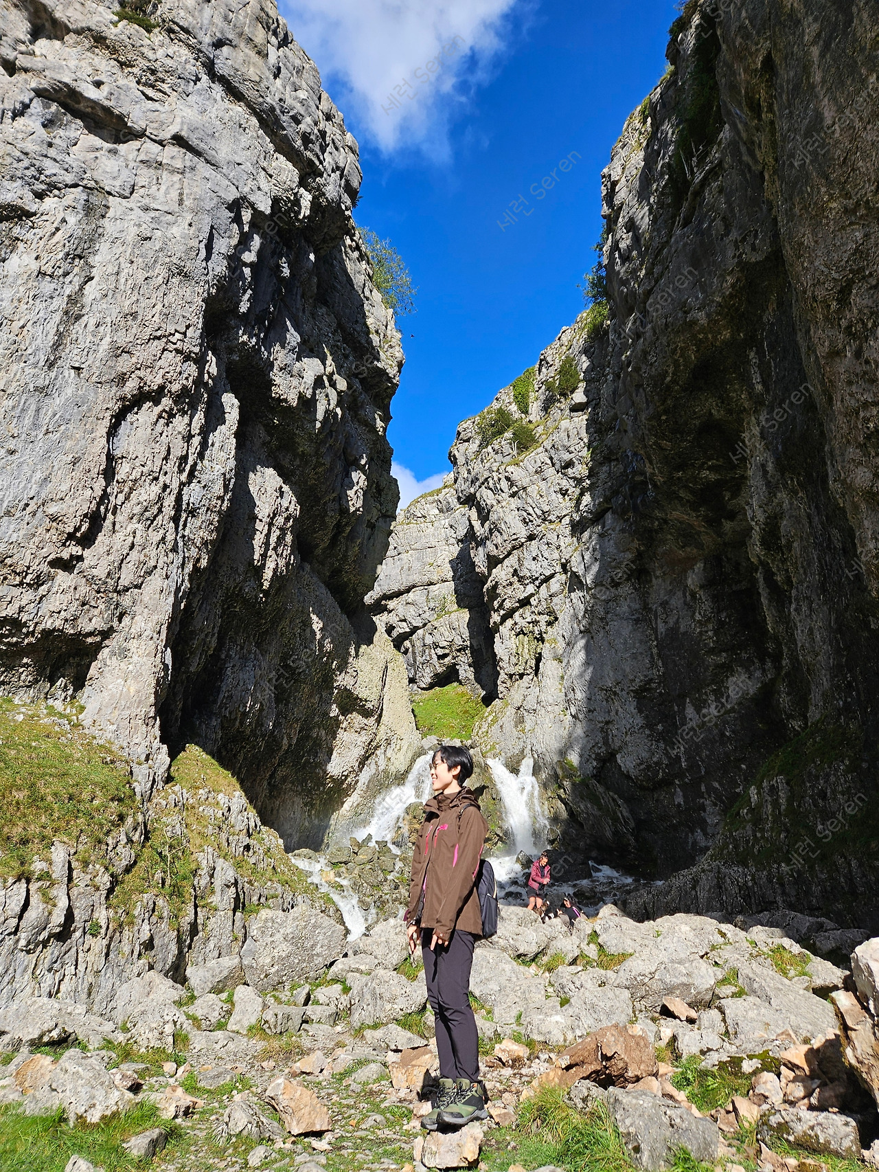 마지막 코스인 Janet’s Foss로 가기 위해 물길을 거슬러 올라갔다. 거대한 바위 사이에 아담하게 자리 잡은 폭포가 나타났다. Janet은 요크셔 지역에서 폭포 옆 동굴에 산다고 전해지는 요정의 여왕 이름이라고 한다.