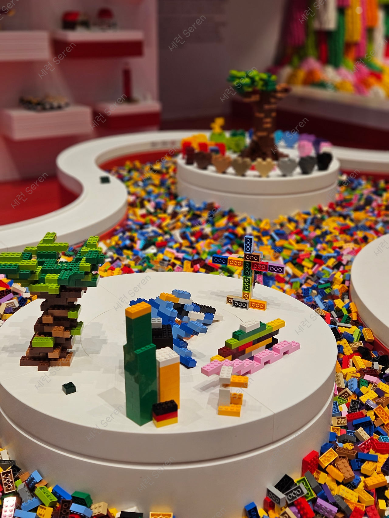 체험 공간에서 여러 테마로 실제 레고를 조립해 볼 수 있다. 신기하게 내가 만든 레고를 스캐너에 올리면 2D 또는 3D로 화면에 띄워주고 실제처럼 움직였다. 그래서 나만의 레고 얼굴과 물고기 만들기가 특히 재미있었다. 판을 스캐너에 올렸더니 얼굴에서 팔다리가 생겨 춤을 추고, 물고기는 레고 바다를 헤엄쳤다. 그리고 체험 전에 입장 팔찌에 있는 바코드를 찍으면 따로 온라인 다운로드를 할 수 있게 저장도 되어 좋았다.
