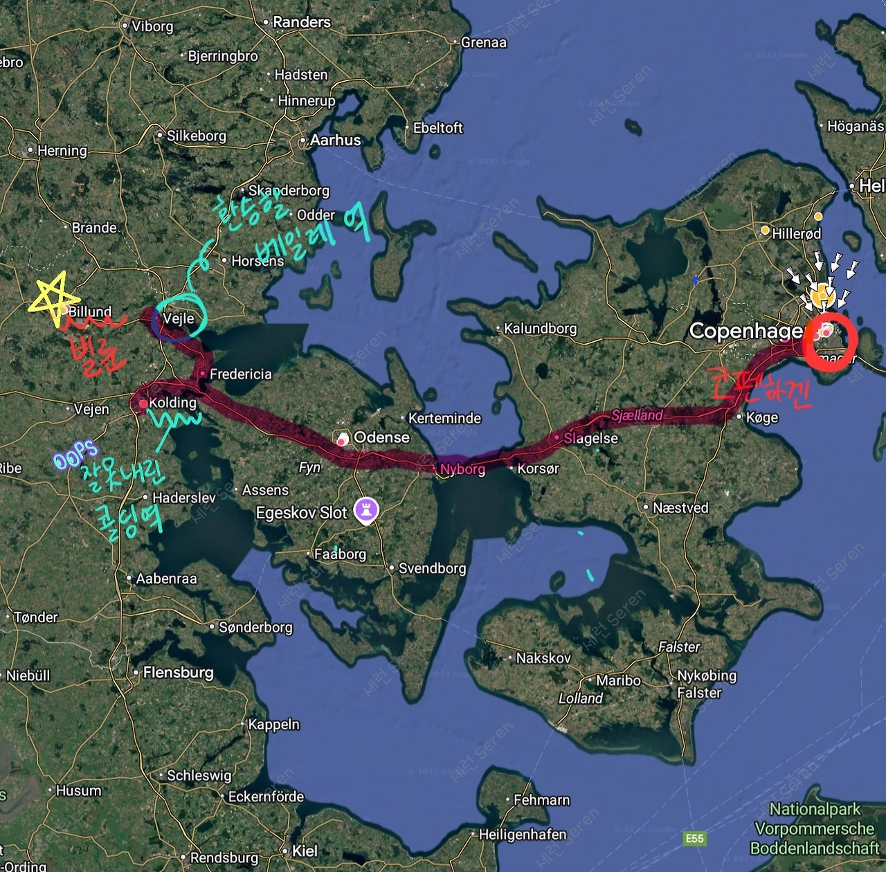 코펜하겐에서 레고랜드가 있는 빌룬(Billund)까지 가야했다. 코펜하겐에서 베일레(Vejle) 역까지 기차로 간 뒤에 빌룬 레고랜드까지 가는 버스를 약 50분 정도 타고 들어가는 걸로 계획을 세웠다.