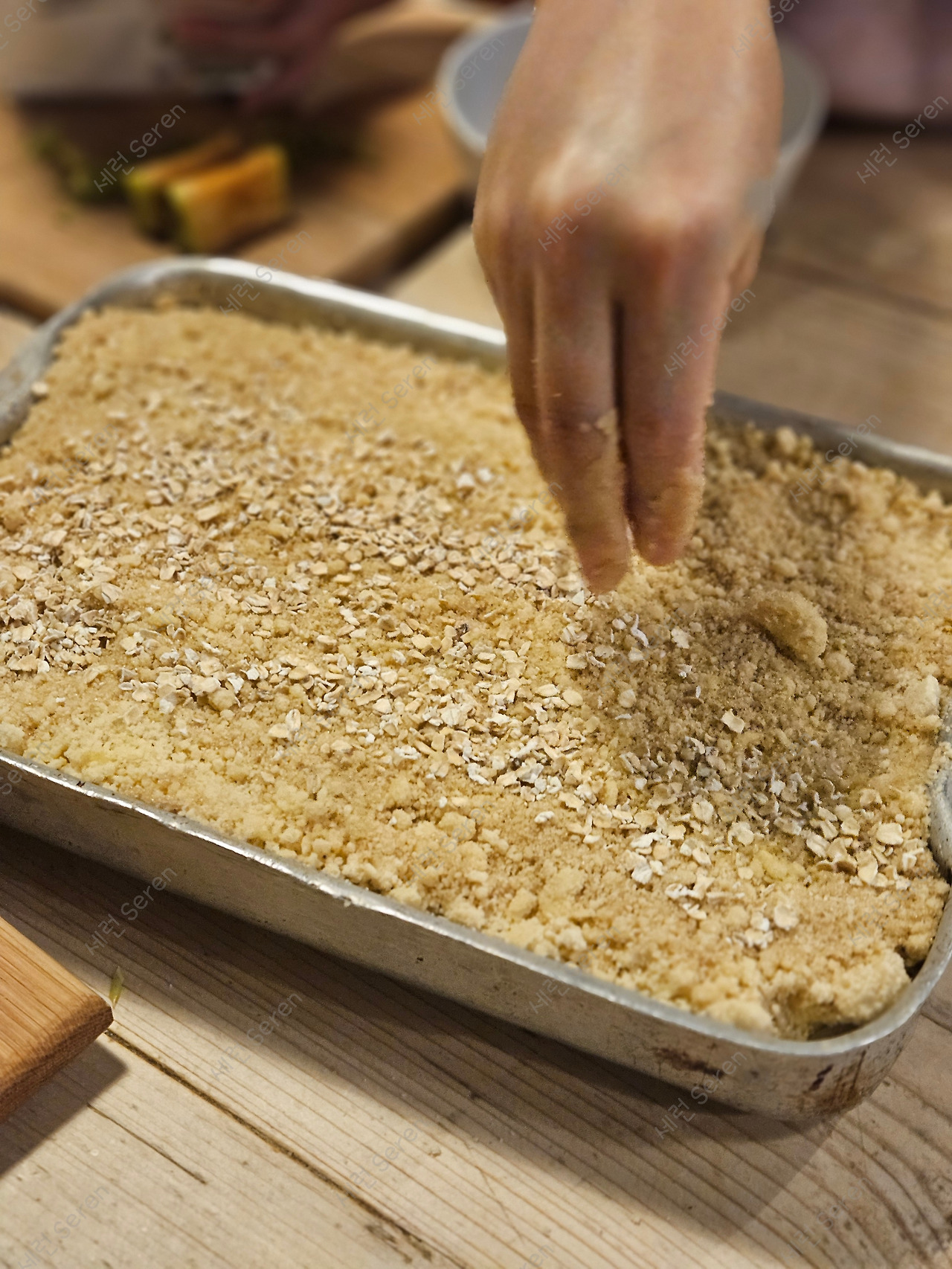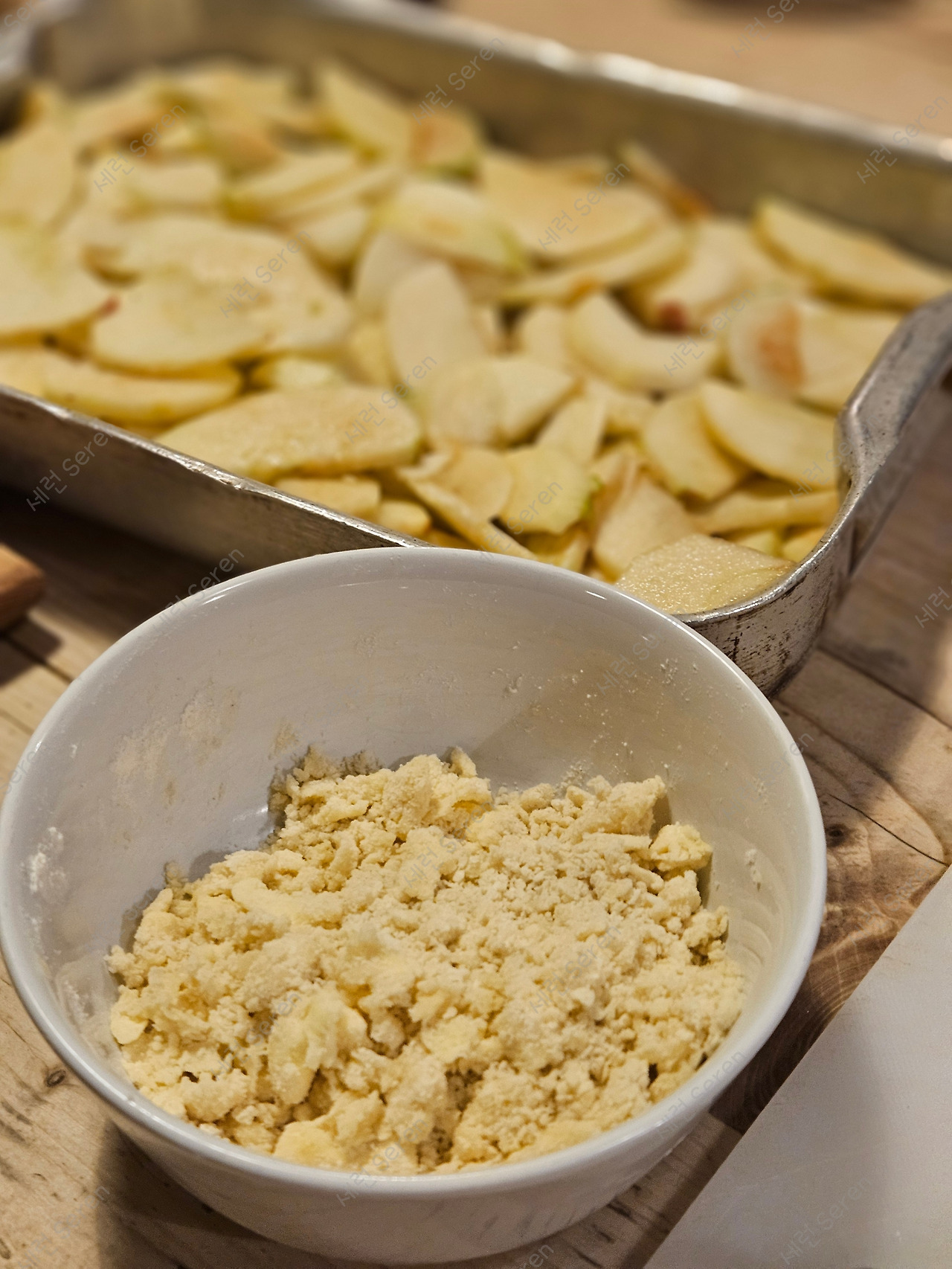 도착해서 준비된 사과를 씻어서 깎는 것부터 했다. 생각보다 어렵지 않았다. 계량하는 방법과 오븐에 넣는 시간까지 섭렵한 건 아니지만, 재료는 사과, 밀가루(Plain Flour), 흑설탕(Light brown soft sugar), 버터(British unsalted butter), 가늘게 빻은 오트밀(Porridge oatmeal)만 있으면 되었다. 오븐 용기에 편 썰기한 사과를 흑설탕에 버무려 평평하게 깔아 둔 뒤에 밀가루와 버터를 섞어 포슬포슬하게 만든 가루 (수제비 만들 듯 찐득한 반죽이 되면 안 된다! 이게 크럼블이 될 예정!)를 얹고, 그 위에 오트밀을 살짝 뿌려준 뒤 오븐에 넣음 된다.