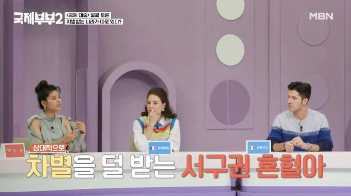 최근 MBN에서 방영된 <국제부부2>에서는 한국 여성과 이란 남성 커플이 출연해 곧 태어날 혼혈 아이의 양육에 대한 고민을 나누었다. 부부는 혼혈인 아이가 한국에서 자라며 왕따나 따돌림을 당하지 않을까 걱정하며 패널들에게 조언을 구했고, 이탈리아, 일본, 프랑스, 미국, 미얀마, 터키 등 다양한 국가 출신의 출연진들은 자신의 경험을 바탕으로 조언과 의견을 나누었다.