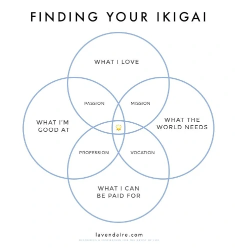 일본어로 ‘인생의 즐거움과 보람’을 뜻하는 '이키가이(Ikigai)'의 개념은 개인의 열정(What I love)과 재능(What I'm good at) 이외에도