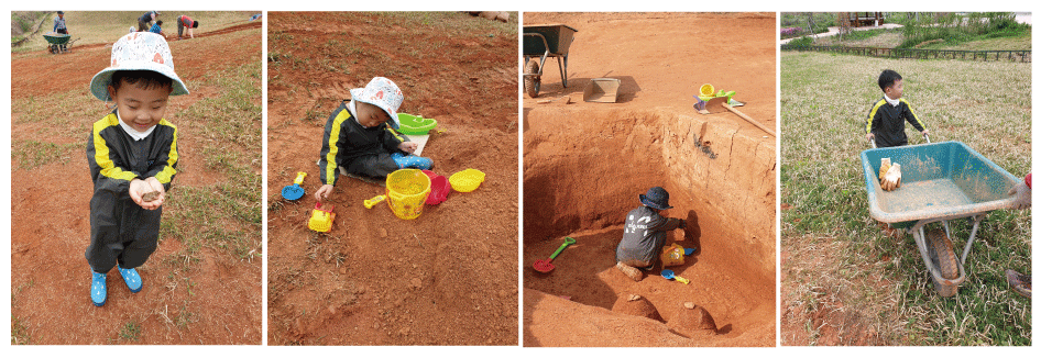 그중의 제일은 역시나 모래놀이 아니던가... 직업상 매일 흙과 삽과 호미를 들고 일하기 때문에 현장이 조금 한가한 날은 호야 군을 데리고 와서 흙놀이, 개구리 잡기, 포크레인 태워 주기 등 자연과 함께 놀게 하였다.