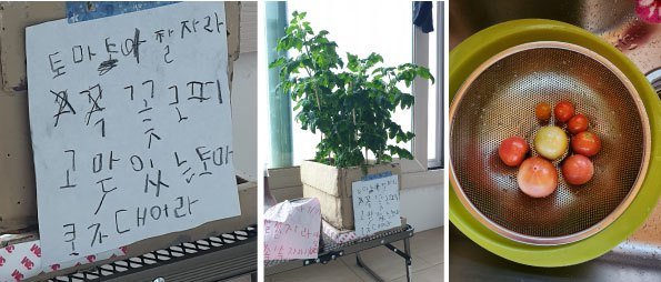 슬슬 시골집이 어느 정도 정돈이 되니 베란다 화분에서 잘 자라지 못하고 있는 방울토마토를 텃밭으로 옮겨심기로 했다. 열매를 바라고 매일 유치원 가기 전에 물을 주고 인사도 했지만 꽤 시간이 지난 후에도 꽃도 안 피고 더 이상의 성장이 없자 호야 군은 극단의 선택으로 토마토에게 편지를 썼다. "토마토야 잘 자라라. 꼭 꽃도 피고 맛있는 토마토가 되어라" 응원의 메시지를 보낸 것이다. 그러나 텃밭으로 옮긴 토마토가 잘 적응하지 못하고 시들시들 죽어가고 안 되겠다 생각했을 때쯤 방울토마토가 하나 두 개 열리기 시작했다. 많이 열리진 않았다. 호야 군은 토마토가 힘을 내줬다고 어찌나 좋아하면서 한입에 꿀꺽해 버렸다. 잔인하구먼...ㅋ