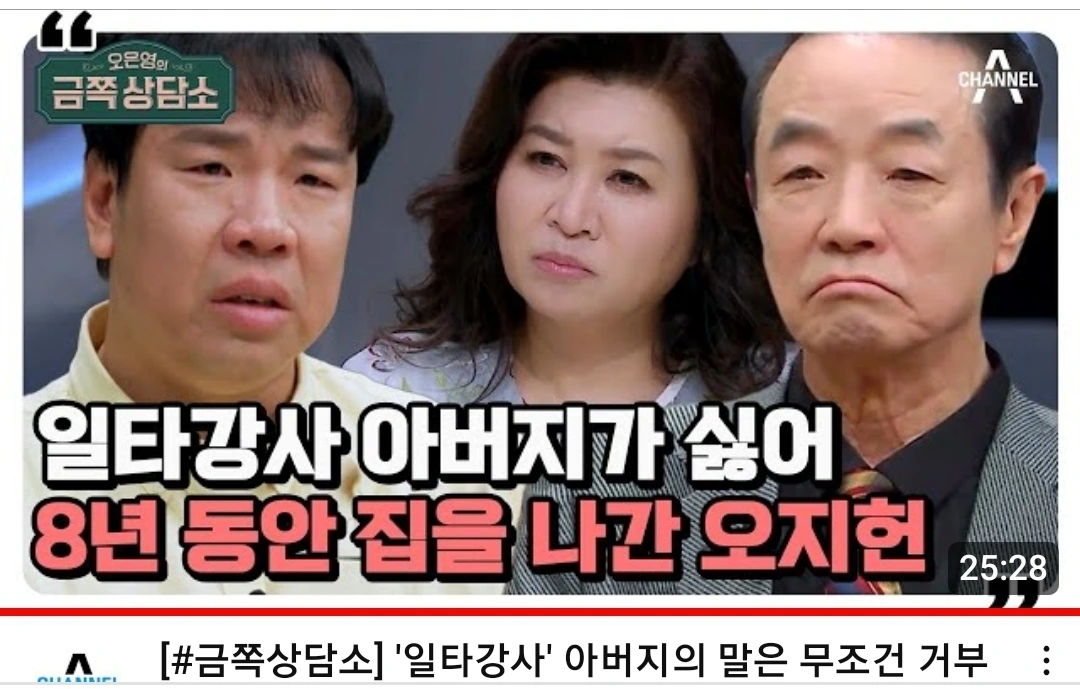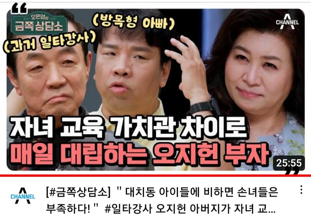 얼마 전 개그맨 오지헌이 금쪽이가 되어 그의 아버지와 함께 《금쪽 상담소》를 찾아왔다. 보통은 혼자, 혹은 엄마와, 혹은 배우자와 함께 나오는데 이번엔 처음 보는 유형이었다. 父子지간. 이들은 어떤 문제를 고민하고 있었을까? 사교육에 대한 찬반 논쟁부터 들어간다!!