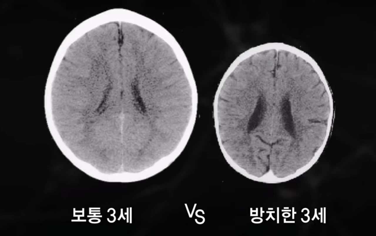 이러한 애착 관계는 아이의 뇌 발달과도 깊은 연관이 있습니다. 엄마의 사랑을 충분히 받은 아이의 뇌와 달리 엄마로부터 방치당한 아이의 뇌는 어떤 모습인 줄 아십니까? 바로 다음 사진과 같은 모습입니다. 방치한 3세의 뇌는 정상적인 3세의 뇌보다 훨씬 작고 쪼그라들어 있습니다. 이것은 부모의 양육 성향이 자녀 두뇌의 크기까지 결정한다는 것을 보여줍니다.