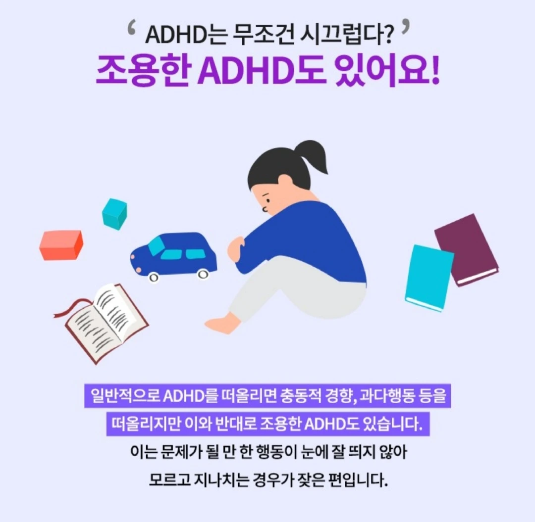 그렇다면 ADHD란 무엇이며 어떤 유형이 있는 걸까? ADHD는 ‘Attention Deficit Hyperactivity Disorder’의 약자로, ‘주의력 결핍’과 ‘과잉행동 장애’ 두 가지 증상을 합쳐서 부르는 용어이다. 우리가 흔히 알고 있는 주의가 산만해서 가만히 앉아 있지 못하고 시도 때도 없이 돌아다니는 아이들이나, 감정 기복이나 충동성이 너무 커서 남에게 피해를 주기까지 하는 아이들은 '과잉행동 장애'라 보면 거의 맞다. 하지만 새로 알게 된 점은 이것만이 전부가 아니라는 것이었다. ‘조용한 (혹은 얌전한) ADHD’로 불리는 증상이 더 있었다. 바로 '주의력 결핍 장애'이다. 그리고 이 두 가지 증상을 모두 겸비한 ADHD도 있다. 사실 ADHD 진단을 받은 사람들 중 이것의 비율이 58%로 가장 높았다.