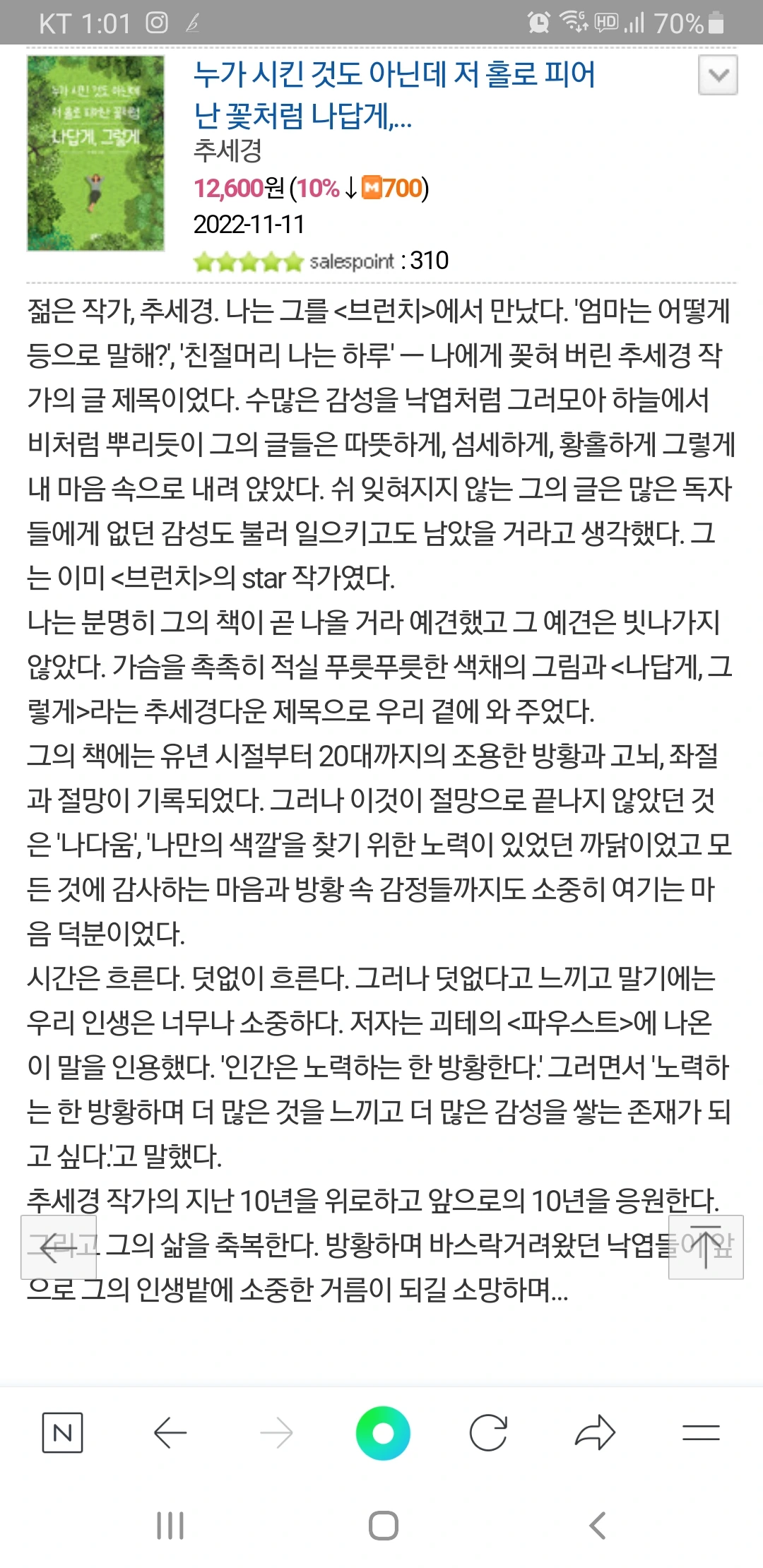 이렇게 예쁘고 귀한 책이 나왔고 책을 통해 그의 삶을, 그의 생각을 공유할 수 있다는 점에서 무한의 기쁨과 감사를 느낍니다. 앞으로도 좋은 글 많이 써 주시고 저처럼 좋은 영향을 받는 수많은 독자들을 양산해 주시길 바랍니다~!!