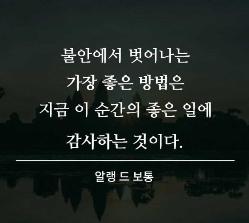 알랭 드 보통이 말한 것처럼, 불안은 자기 자신을 하찮은 존재로 치부할 때 찾아온다. 자기 자신을 부정적이거나 비판적으로 판단하면 아무리 남들이 자신을 인정한다 해도 자기를 수용할 수 없는 것이다.