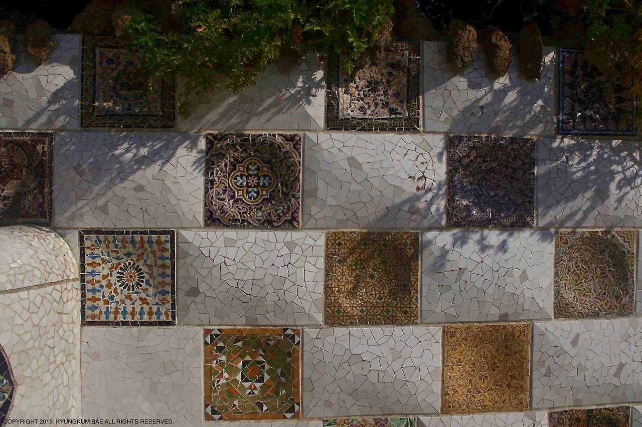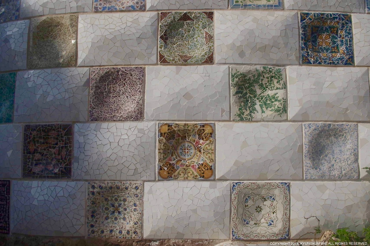완전한 사각 모양의 타일을 작은 조각들로 깨뜨려 해체하였다가, 깨진 타일 조각들을 다시 조합하여 독창적인 작품으로 재창조한 가우디의 예술성이 놀라울 따름이었다. 화려한 타일의 패턴이 주변 경관과 어우러지면서 인위적임에도 거북스럽지 않았다.