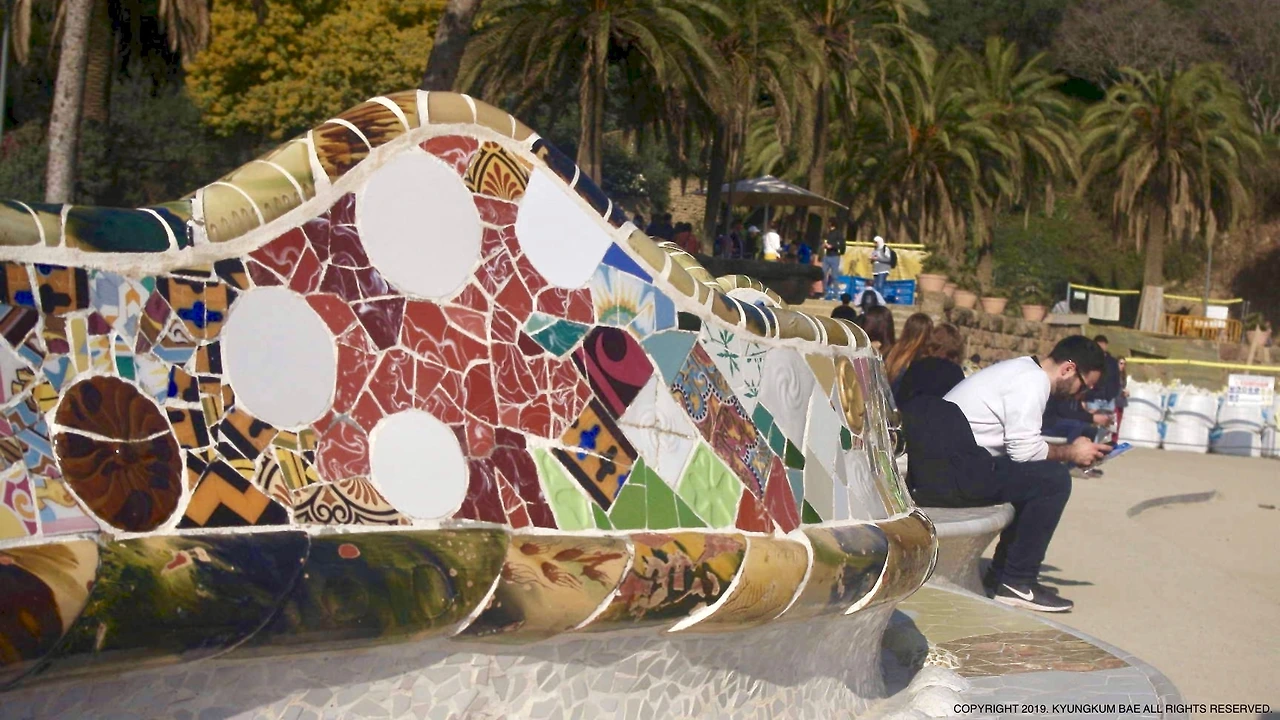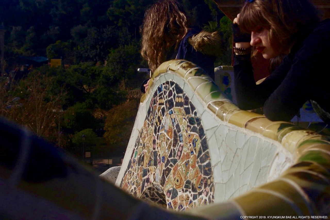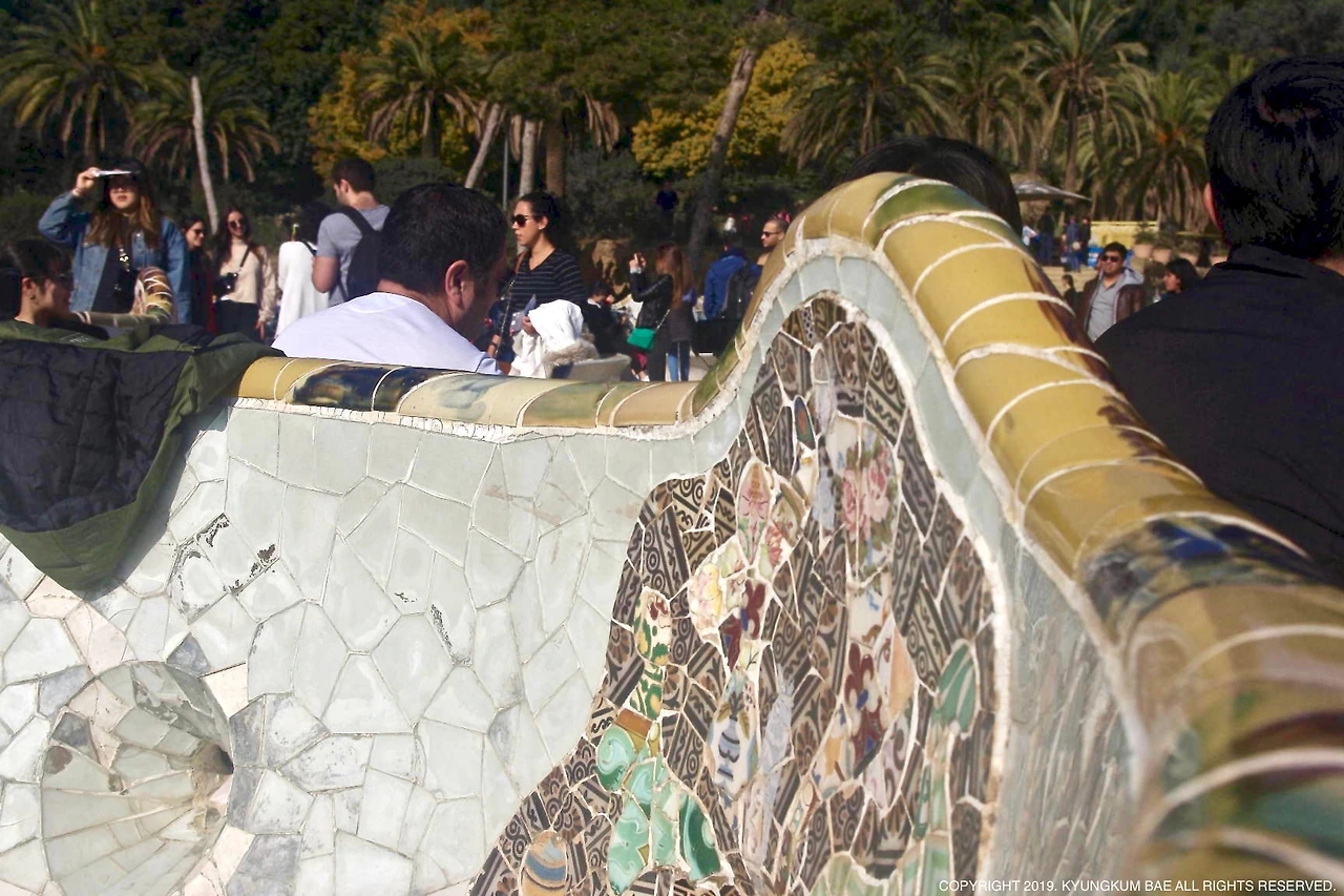 공원 벽면의 타일 장식은 햇살이 반사되어 원래 가진 빛보다 더 반짝거린다. 문양이 있는 타일의 가운데를 오목하게 처리해서 그런지 입체감이 느껴진다. 벽면이 물결친다. 직접 만나본 적은 없지만 왠지 가우디는 유쾌하고, 장난기 가득한 예술가였을 것만 같다. 그의 건축물과 작품 곳곳에서 흘러나오는 흥겨운 바이브(vibe)는 바르셀로나의 경쾌한 분위기와 매우 닮아 있다.