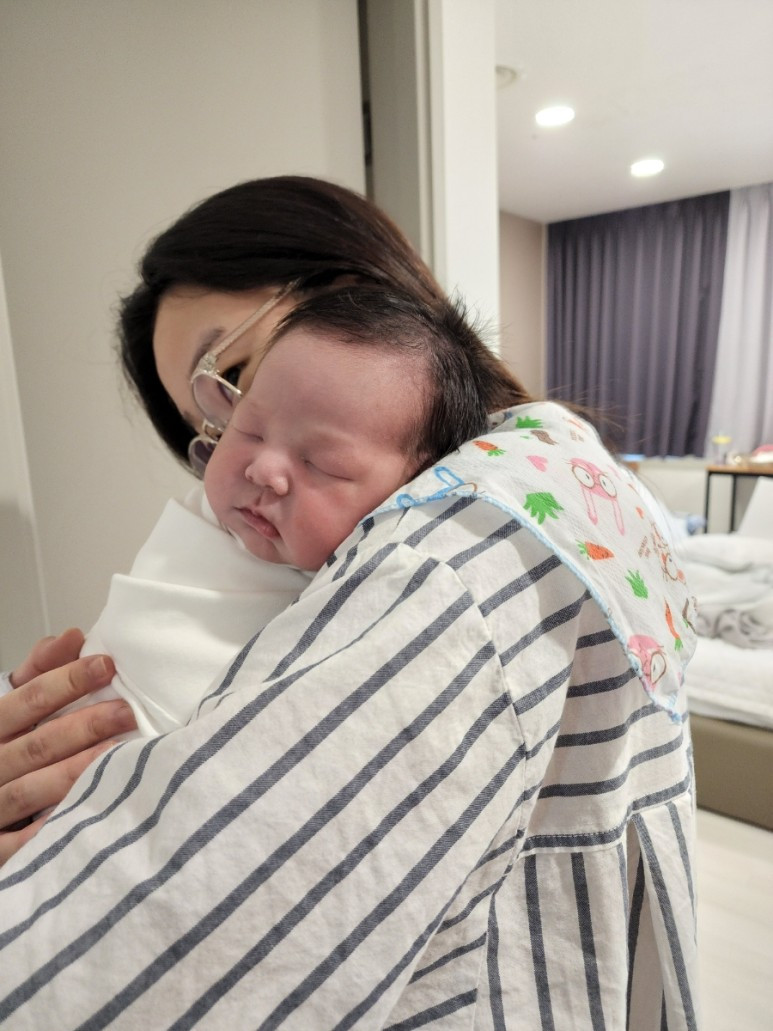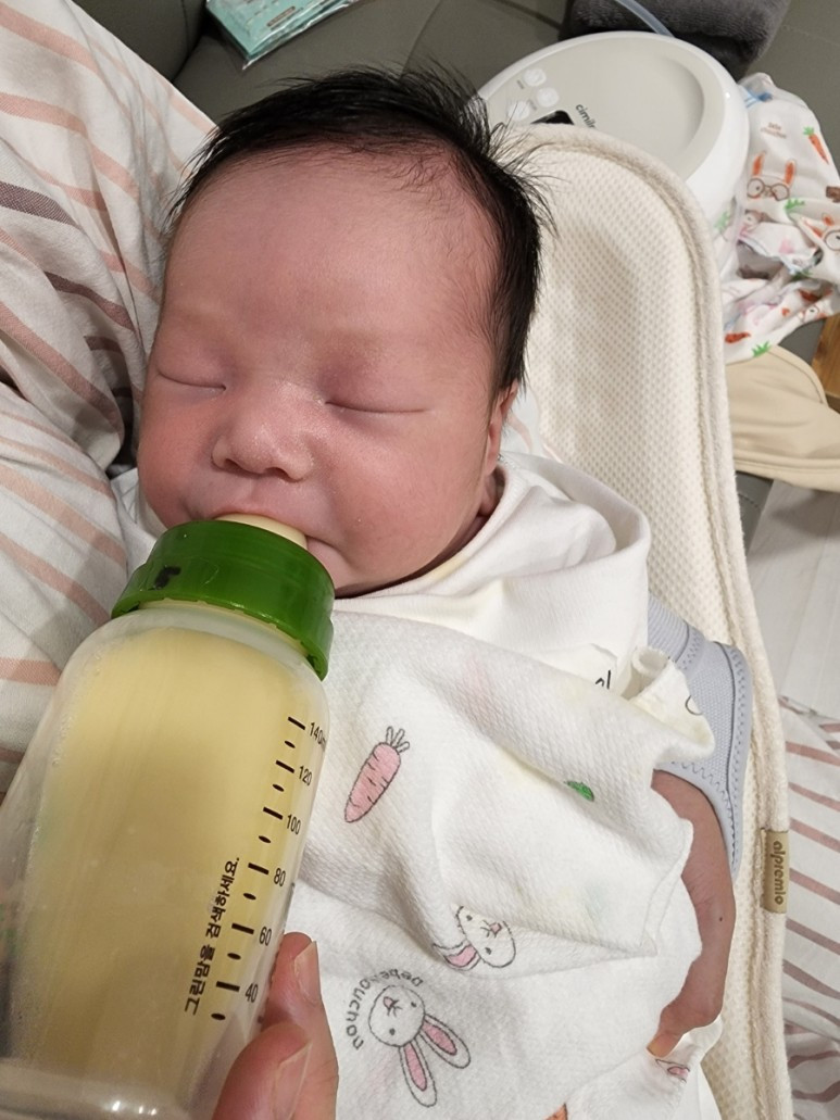 출산 후 이렇게 모유 스트레스를 받은 이유는 아마도 아기를 하루 한번만 안아볼 수 있었던 5박6일의 입원기간과 조리원 입소 후에도 기저귀 발진 때문에 3일차에야 모유수유 연습을 시작한 영향도 있는거 같다. 왜냐하면, 서툴지만 처음으로 아기가 모유를 먹는 모습을 보니 유축만하던 젖소가 된 기분에서 진짜 모유(母乳)를 주는 기분이 들기 때문이다. 내 몸에 베이는 아기의 냄새도 기분이 좋다.