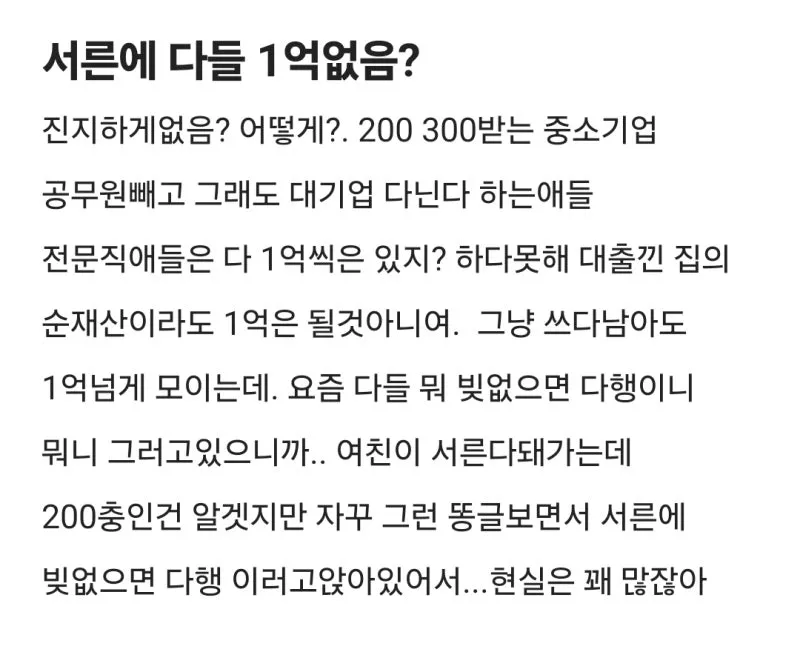 누군가는 부모의 지원으로 전세금을 억대로 받아 오피스텔에서 돈을 모은다.