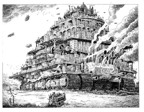 그러나 이 거추장스러운 시대의 도시들은 우리가 꿈도 못꾸는 일을 한다. 이동하는 것이다. 거대한 증기기관과 바퀴를 이용하여 런던이 움직일 수 있을까? 실제로 강력한 강철구조물과 캐터필라로 구성된 유목 도시의 아이디어가 제안된 적이 있다.