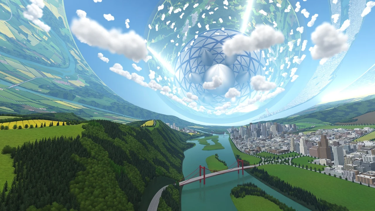 원통의 내부에는 인공 태양 조명이 비치고 하늘도 있으며 하늘에는 구름이 떠 있고 강과 바다와 경작지가 있다. 원통 안쪽 면을 따라 대지와 도시가 펼쳐지므로 땅은 둥근 벽면에도 그리고 천정에도 있다. 이 원통은 회전함으로써 원심력을 통해 중력을 만들어낸다. (https://www.youtube.com/watch?v=UiO8CgGiWPM)