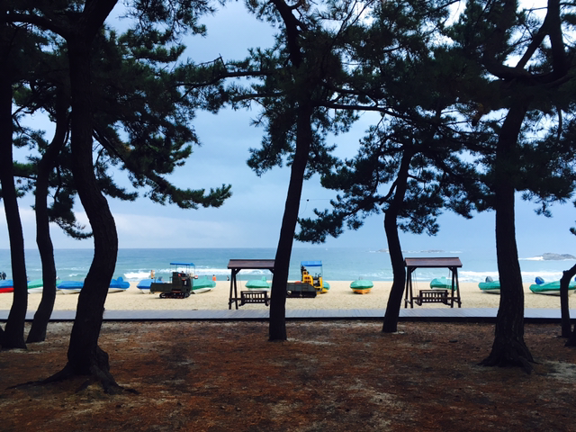 다시 바다 이야기. 강릉 하면 역시 경포대 해수욕장이다. 1박 2일을 있으면서 영진해수욕장, 경포대해수욕장, 안목해변 이렇게 세 군데의 해변을 갔는데 경포대가 가장 좋았다. 이유는? 영진해수욕장의 모래사장 뒤로는 벽이 쳐져있어 별로고, 안목해변은 카페와 상업적인 분위기가 가득해 별로인데 경포대해수욕장은 모래사장 뒤에 솔숲 산책로가 있다. 솔과 바다가 어우러진 그 풍경은 정말 기막히다고 할 만하다.