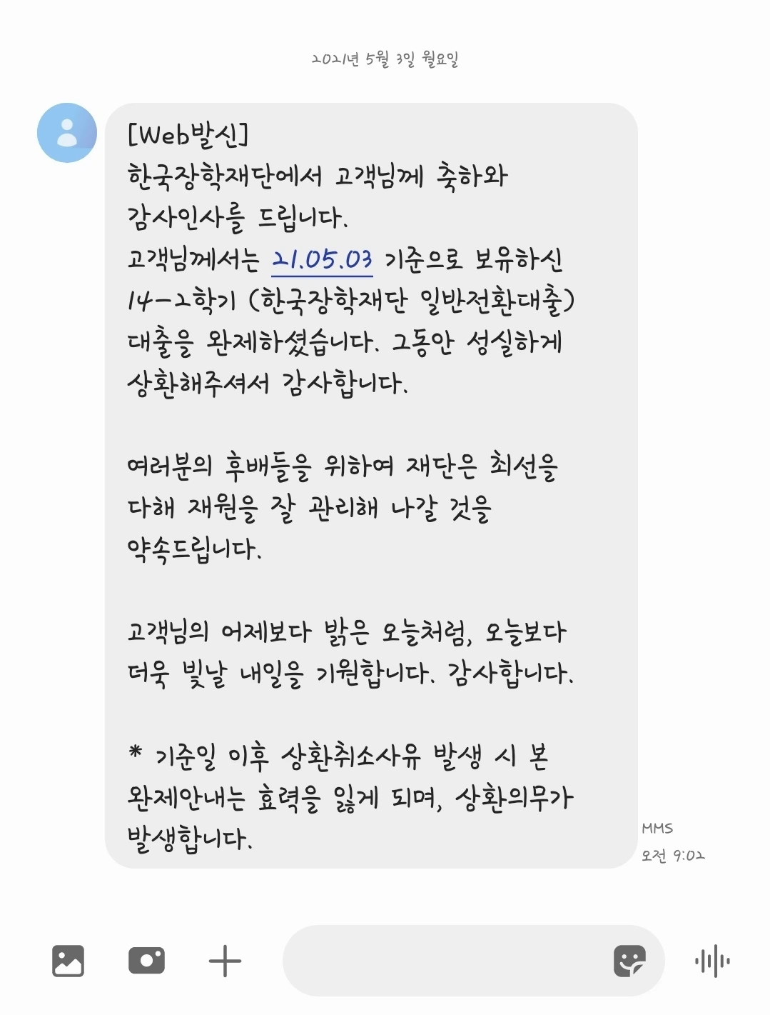 마지막으로 날아왔던 한국장학재단으로부터의 문자 한 통.