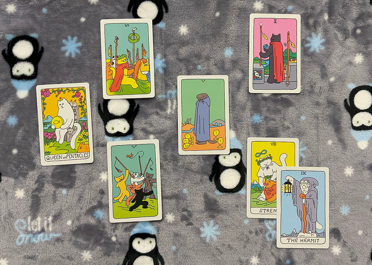 가장 먼저 들인 것은 모험고양이 타로 카드와 신성한 깃털 메신저 오라클 카드다. 펫 타로를 보고 싶어서 고양이를 주제로 한 타로 카드를 이리저리 비교하다가 아기자기하면서 유니버셜 웨이트의 상징 체계를 충실히 담고 있는 모험고양이 타로 카드로 결정했다. 패닝은 스프레드 천을 깔 필요가 없을 정도로 수월하지만 그만큼 셔플할 때 손에서 잘 미끄러진다. 뭐든 일장일단이 있는 법.