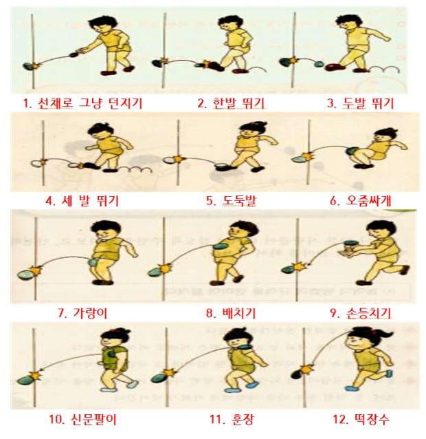 비석 치기는 납작하고 잘 세워지는 돌을 먼저 구하는게 관건이었다. 시골에서는 널린 게 돌이였으니 구하는 건 그리 어렵지 않았다. 약 5미터 쯤 되는 거리에서 상대방 비석을 세워 놓고 맞추는 놀이였다. 단순히 손으로 던져서 맞추는 것 이외에도 밑에 그림처럼 여러가지 미션이 있다. 순서대로 다 맞춰야 이기는 것이다. 한발 뛰고 맞추기, 배에 올리고 맞추기, 어깨 올리고 맞추기 등 뒤로 가면 갈수록 고난이도 기술을 요한다.