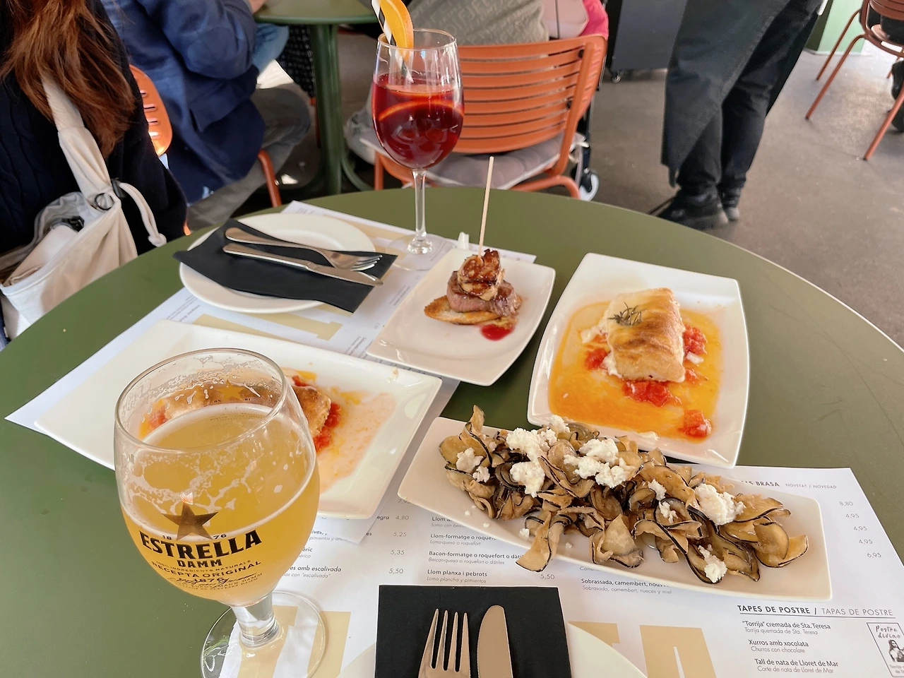 오전시간에 이렇게 구경을 하고 나서, 점심시간을 가졌다. 가이드 분께서 쭉 맛집을 리스트에 메뉴까지 정리해서 보내주셨다. 가이드 투어를 받으면서 가우디에 대해 많이 알게 되는 것도 좋았지만, 스페인 여행에 있어서 필요한 정보들을 스페인에 살고 있고 직접 경험한 게 많은 가이드분께 물어서 대답을 들을 수 있는 것도 굉장히 큰 장점이라고 느껴졌다. 가이드 분이 안내한 식당은 밖에서 먹을 수 있는 곳이었고 추천 메뉴 중에 먹고 싶은 음식인 꿀대구와 타파스, 레몬맥주 클라라, 샹그리아등을 시켜서 정말 여유롭게 지나가는 스페인 사람들을 구경하기도 하며 음식에 감탄하기도 하며 시간을 보내다 보니 또 모이기로 한 시간이 됐다. 스페인은 식사를 할 때, 식사와 술을 곁들이는 게 아주 자연스러운 문화다. 나는 평소에 술을 마시는 사람은 아니지만, 스페인 여행 동안은 샹그리아를 음료처럼 마셨던 거 같다. 와인에 달콤한 과일이 들어가 있는 샹그리아가 어찌나 맛있던지. 약간의 알코올은 나를 여행 중에 더 기분 좋게 만들어주는 역할을 했던 거 같다. 그렇게 행복한 점심시간을 보낸 후, 오후엔 전철을 타고 제일 유명한 사그라다 파밀리아(성가족 성당)로 가기로 했다.
