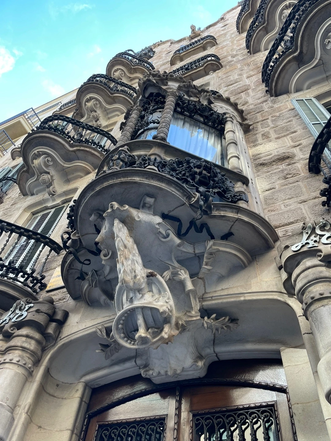 처음에 방문했던 건축물은 가우디가 유명해지기 전, 건축했던 건물인데 여러 건축물들 사이에 있어도 첫눈에 가장 예쁘다는 느낌이 들었다. 가우디가 활동했을 당시, 스페인의 산업이 발달하여 부자집안이 많이 나왔었는데 그 시대에 돈을 번 사람들은 본인들의 집을 특색 있고 예쁘게 꾸미는 게 유행이었다고 했다. 가우디는 신앙이 깊은 사람이어서 본인이 지은 건축물에는 꼭 본인의 시그니처인 십자가를 만들어 넣었다고 했다. 처음에 우리가 봤던 건축물은 가우디가 유명해지기 전이어서 가우디의 특색이 많이 나타나진 않았다고 했다. 가우디가 본인의 색깔을 선명하게 드러낸 시기는 이 처음 건축물이 대상을 받고 나서부터였다고 했다. 천재 건축가 가우디도 처음부터 본인의 색깔이 선명한 사람은 아니었다는 것. 그리고 조금씩 인정을 받으며 점점 더 본인의 색깔을 찾았다는 것. 동서를 막론하고 통용되는 진리인 거 같아서 신기했다. 그리고 내가 용기를 얻었다고 할까?