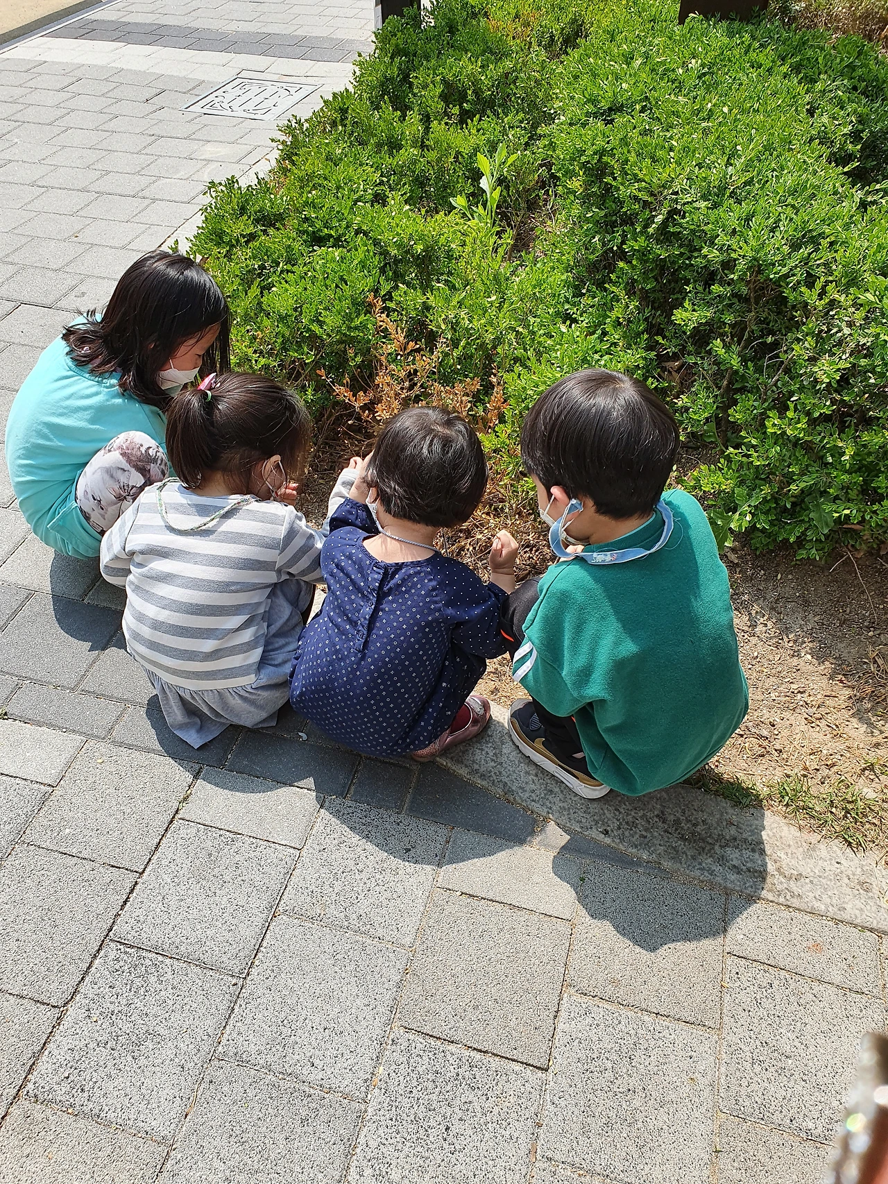 애벌레 구경중인 아이들(맨 왼쪽은 동네 언니)쪼꼬미들이 애벌레의 출현을 알리자, 동네 초등 언니 오빠들도 하나 둘 와서 애벌레의 거처에 대해 논의했다. 대체로 남자아이들은 나뭇가지로 툭툭 건드려보거나 장난치려고 하는 데 비해, 여자 아이들은 애벌레도 생명인데 건들지 말라며 야단을 치는가 하면, 애벌레가 집까지 잘 가는지 봐야겠다며 걱정하기도 했다. 나 역시도 왠지 작은 생명을 아이들이 귀찮게 하는 것 같아, 그만 보고 가자고, 애벌레가 힘들어한다고 채근했으나, 30분은 족히 봤지 싶다.